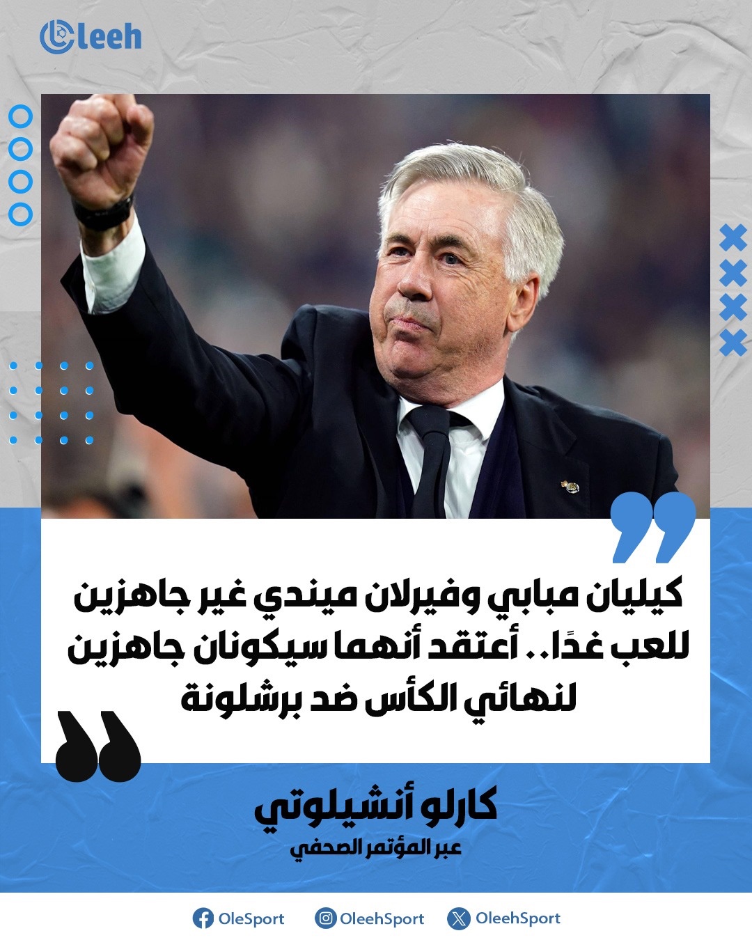 أنشيلوتي: "كيليان مبابي وفيرلان ميندي غير جاهزين للعب غدًا ضد خيتافي... لكن أعتقد أنهما سيكونان جاهزين لنهائي الكأس ضد برشلونة"