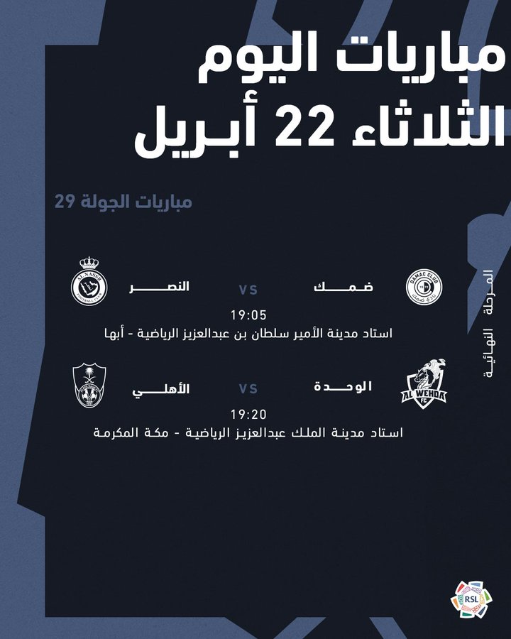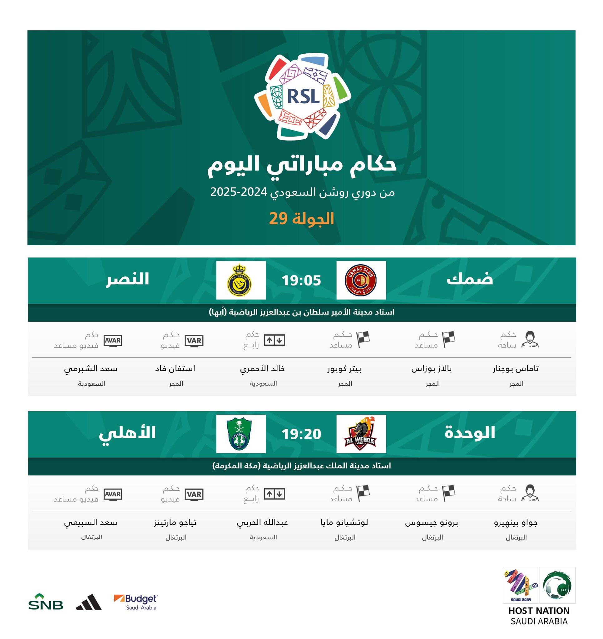 مواجهتان في اليوم الثاني من الجولة 29 من دوري روشن السعودي. صافرة مجرية وبرتغالية لإدارة المباراتين بحسب ما أعلنه اتحاد كرة القدم