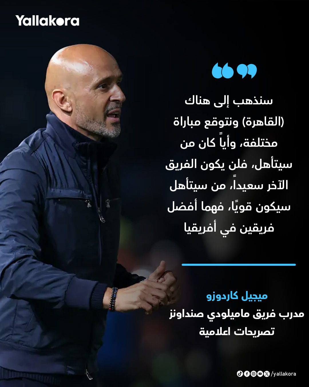 مدرب صنداونز. "سنذهب إلى هناك (القاهرة) ونتوقع مباراة مختلفة، وأياً كان من سيتأهل، فلن يكون الفريق الآخر سعيداً، من سيتأهل سيكون قويًا، فهما أفضل فريقين في أفريقيا وسيعاني أحدهما في النهاية"