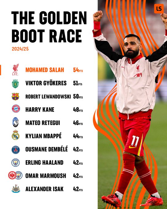 لا يزال المصري محمد صلاح نجم ليفربول يتربع على صدارة المرشحين لجائزة الحذاء الذهبي لهذا الموسم
