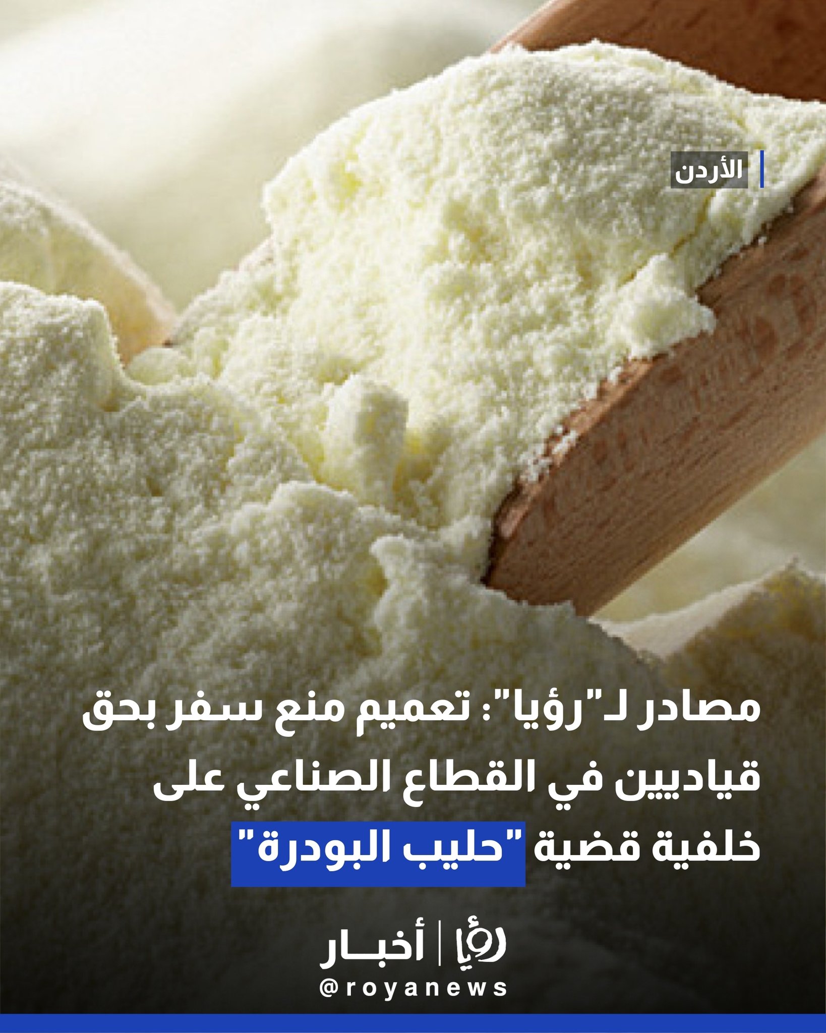 مصادر ل"رؤيا": تعميم منع سفر بحق قياديين في القطاع الصناعي على خلفية قضية "حليب البودرة" #عاجل