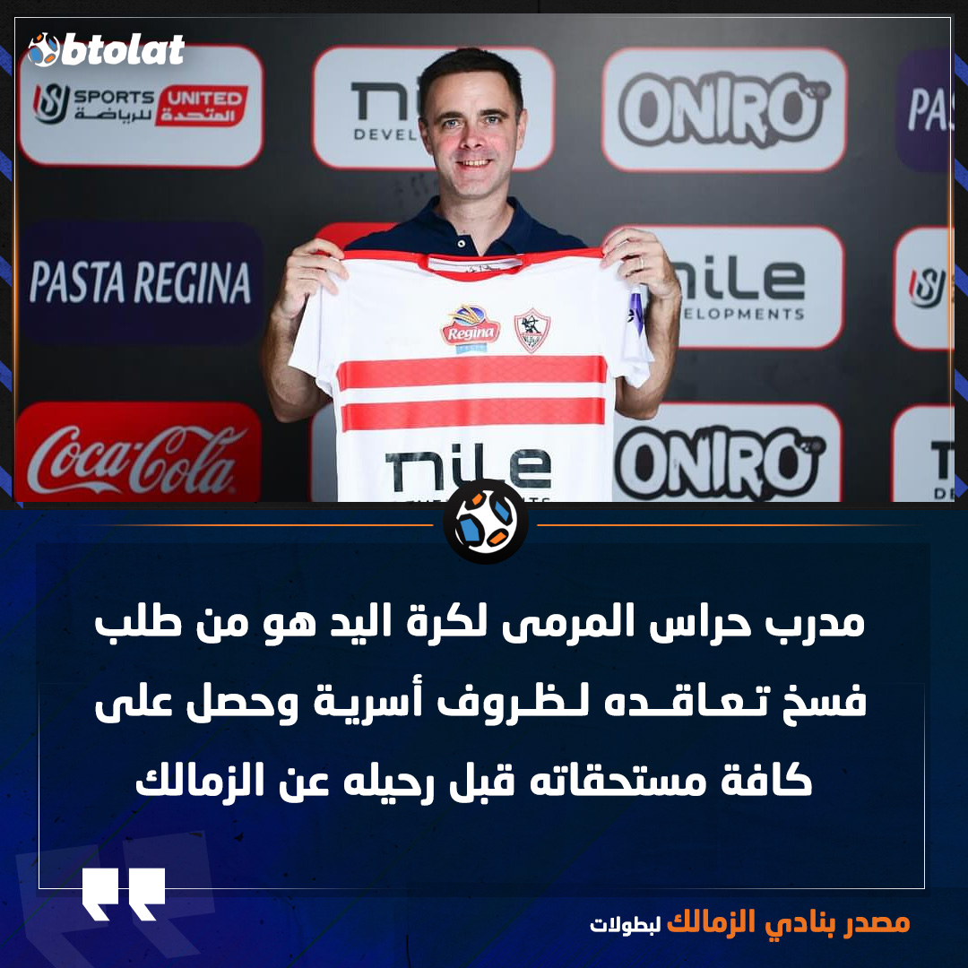 مصدر بنادي الزمالك ل بطولات: مدرب حراس المرمى لكرة اليد هو من طلب فسخ تعاقده لظروف أسرية وحصل على كافة مستحقاته قبل رحيله عن الزمالك