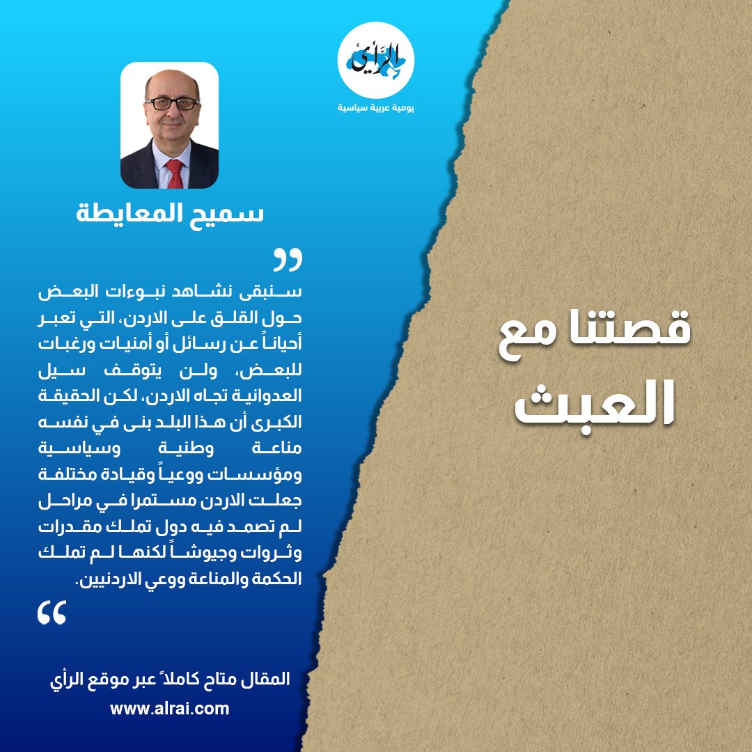 قصتنا في الاردن مع العبث جزء من الثمن الذي ندفعه نتيجة الجغرافيا التي نعيش فيها، ونأخذ حصتنا من المؤامرات ومحاولات المس بأمننا بل ببقاء الدولة من طبيعة هذا الإقليم وخارطة الاشرار وبائعي الأوهام وتجار شعارات العروبة والاسلام.