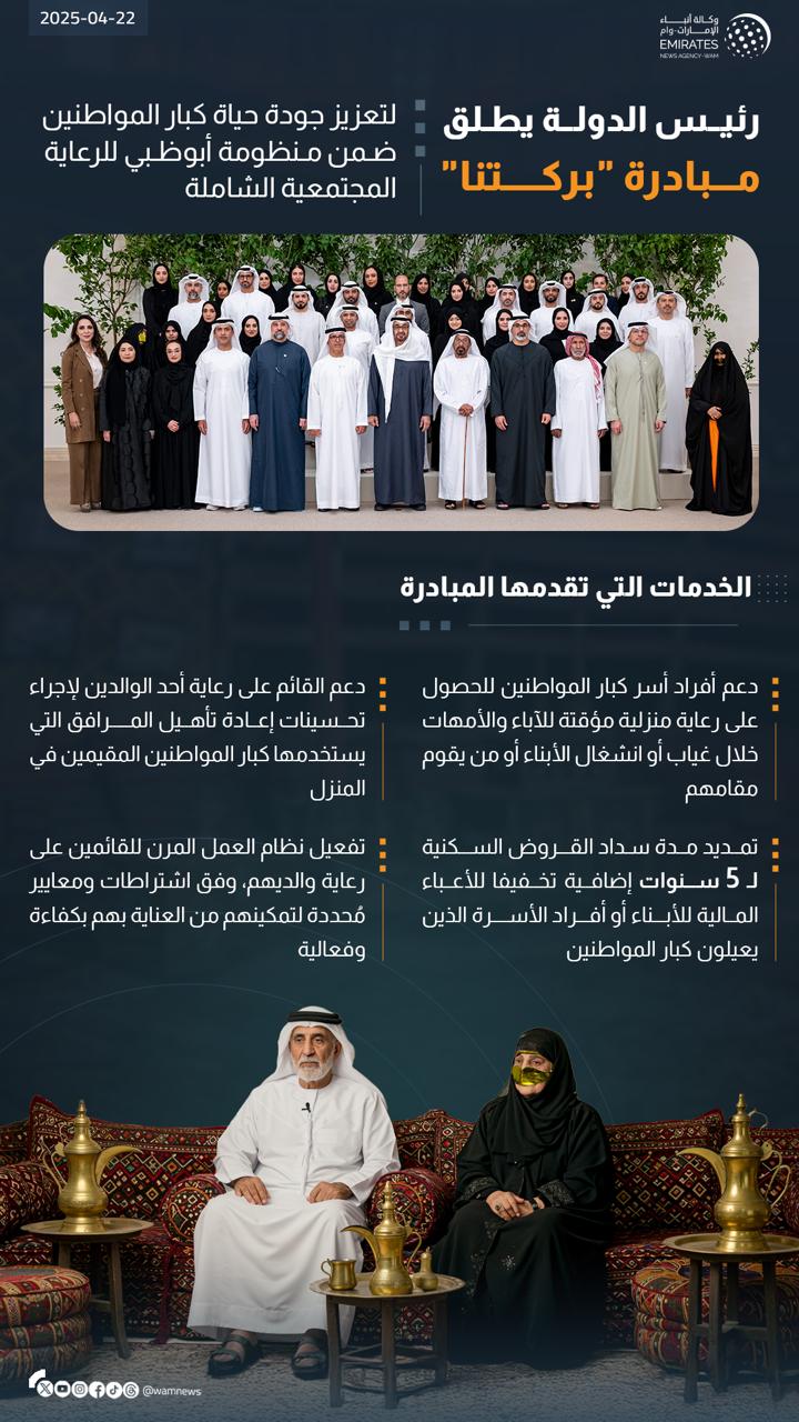 أبوظبي في 22 أبريل /وام/ أطلق صاحب السمو الشيخ محمد بن زايد آل نهيان، رئيس الدولة "حفظه الله" اليوم، بحضور سمو الشيخ خالد بن محمد بن زايد آل نهيان، ولي عهد أبوظبي، مبادرة "بركتنا" التي تستهدف كبار المواطنين، ضمن منظومة أبوظبي للرعاية المجتمعية الشاملة للارتقاء بجودة حياتهم وضمان رفاهيتهم إضافة إلى دعم قيم الترابط الأسري والتماسك المجتمعي.