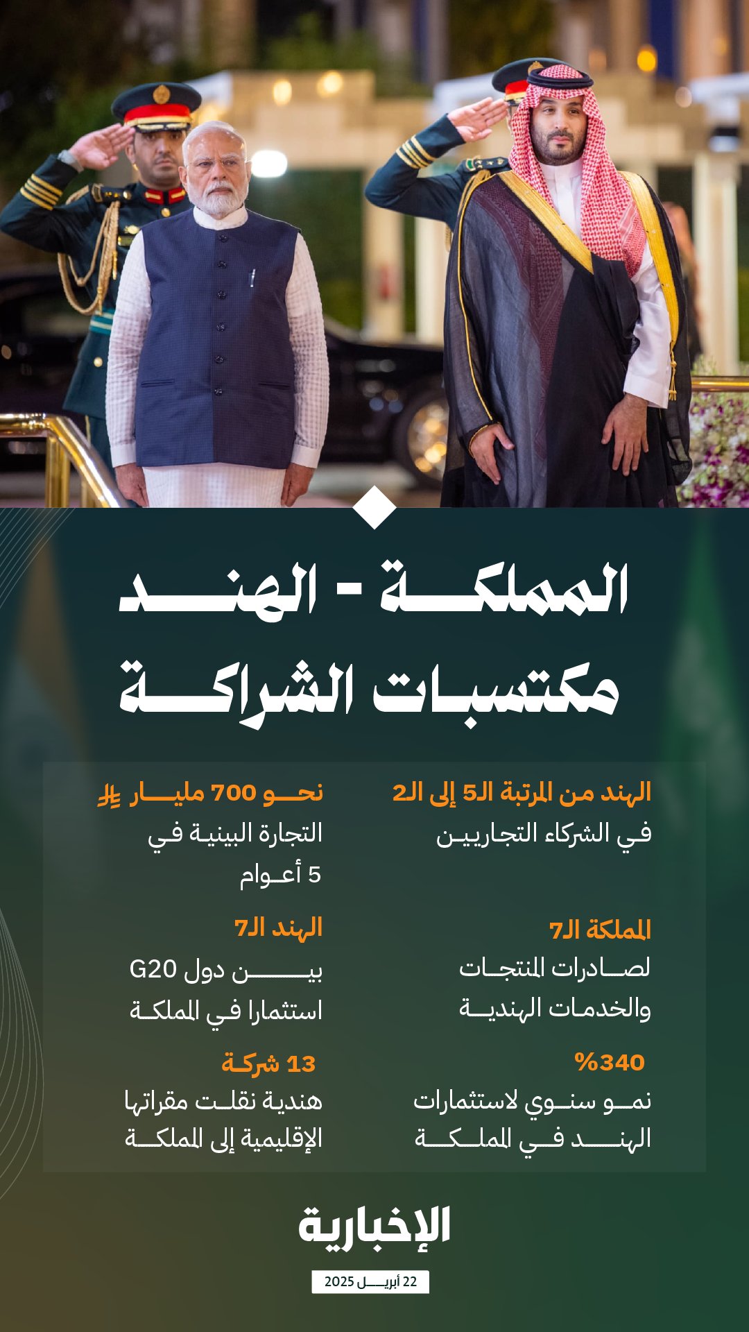 إنفوغرافيك الإخبارية | الشراكة السعودية الهندية في أرقام... تصاعد تجاري واستثماري يعكس متانة العلاقات رئيس الوزراء الهندي في المملكة | #الإخبارية
