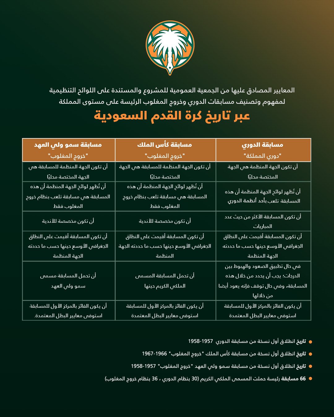 عاجل| الاتحاد السعودي لكرة القدم يعلم المعايير المصادق عليها من الجمعية العمومية للمشروع والمستندة على اللوائح التنظيمية لمفهوم وتصنيف مسابقات الدوري وخروج المغلوب الرئيسة على مستوى المملكة عبر تاريخ كرة القدم السعودية