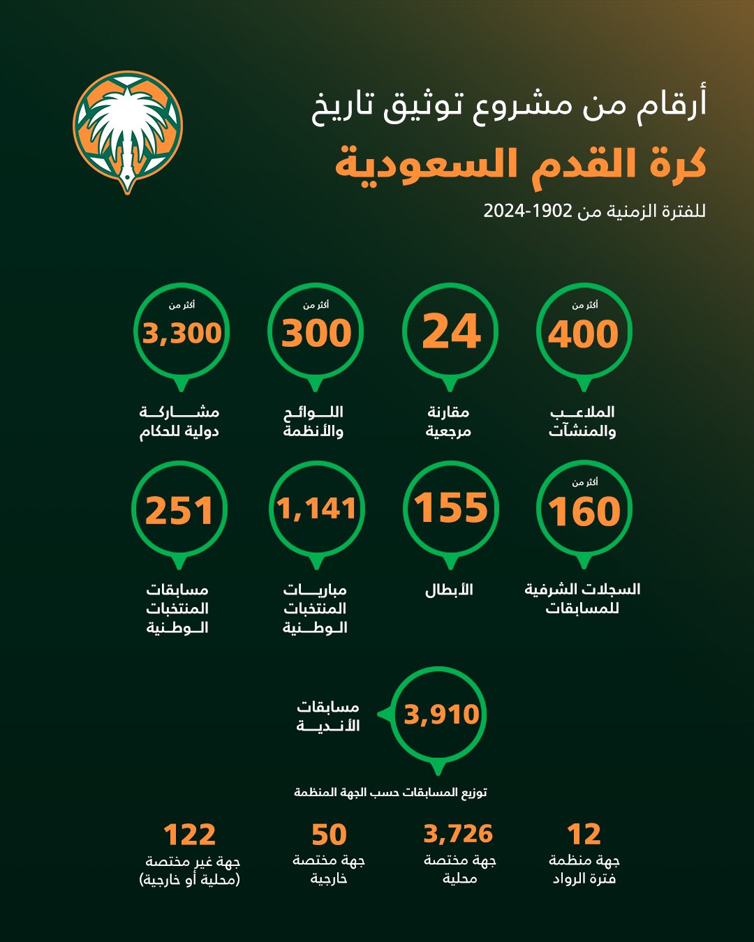عاجل | الاتحاد السعودي لكرة القدم يعلن أبرز أرقام مشروع توثيق تاريخ كرة القدم السعودية للفترة الزمنية من 1902 حتى 2024