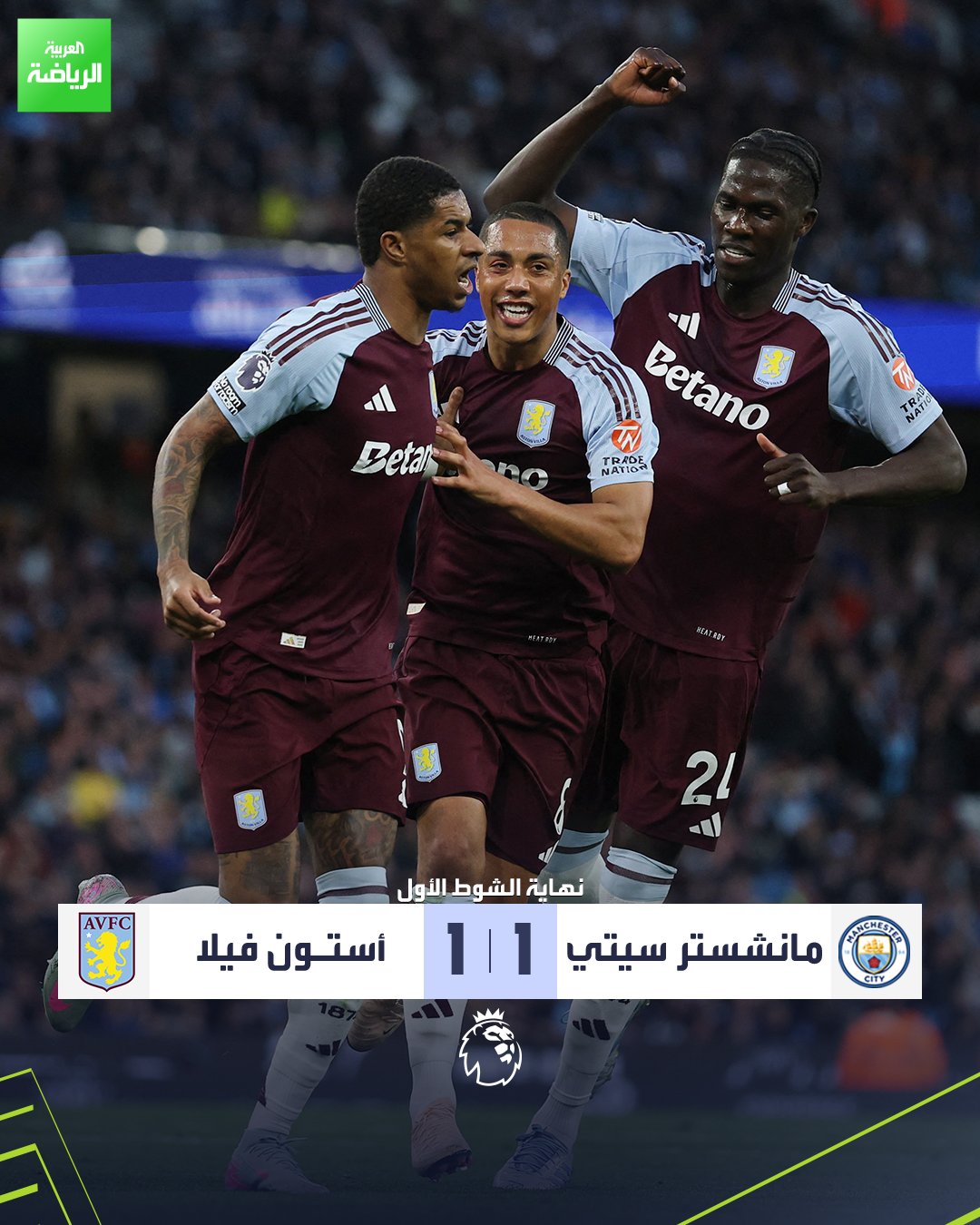 صراع المراكز المؤهلة لدوري الأبطال. نهاية الشوط الأول بالتعادل بهدف لمثله. مانشستر سيتي 1 (برناردو) أستون فيلا 1 (راشفورد) الدوري الإنجليزي الاتحاد _رياضة