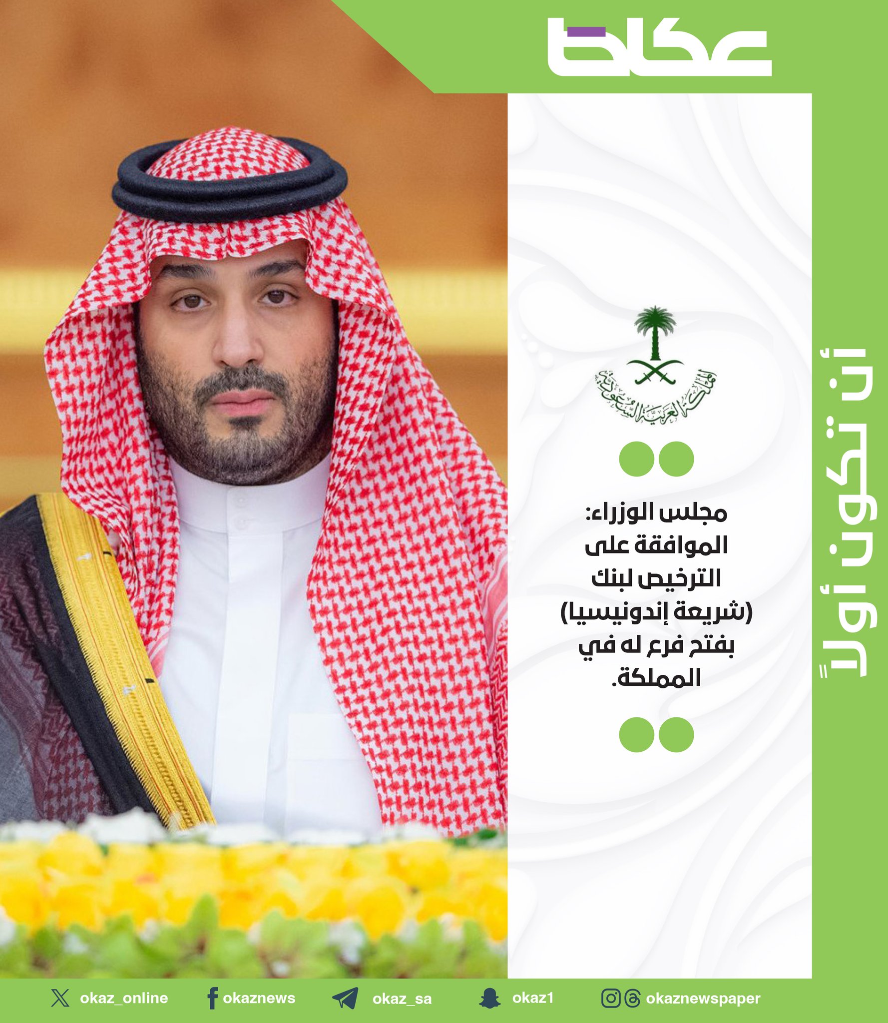 مجلس الوزراء: الموافقة على الترخيص لبنك (شريعة إندونيسيا) بفتح فرع له في المملكة. للاطلاع على
