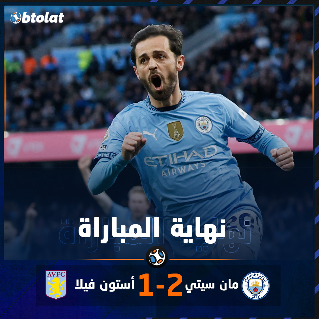 نهاية المباراة! السيتي يخطف فوز حاسم في الوقت بدل الضائع وينتصر أمام أستون فيلا بنتيجة 2-1 في الدوري الإنجليزي