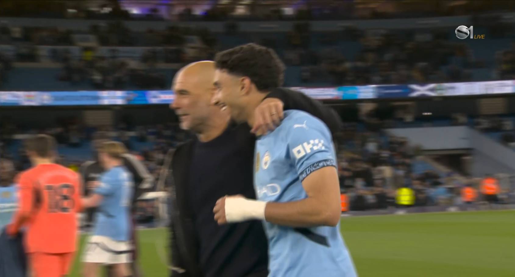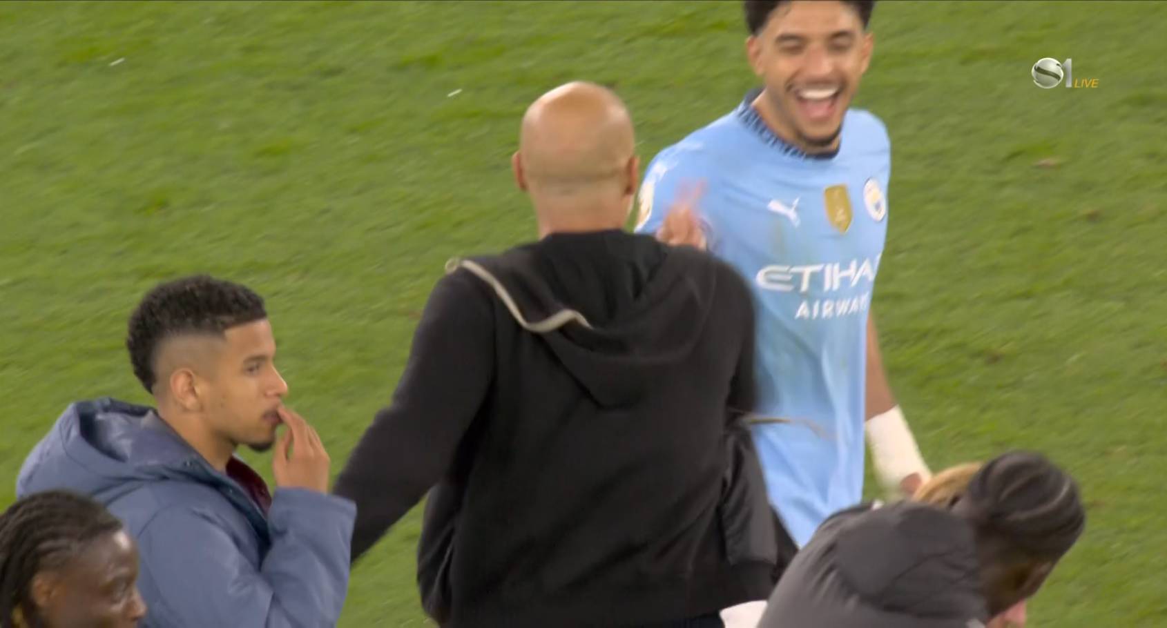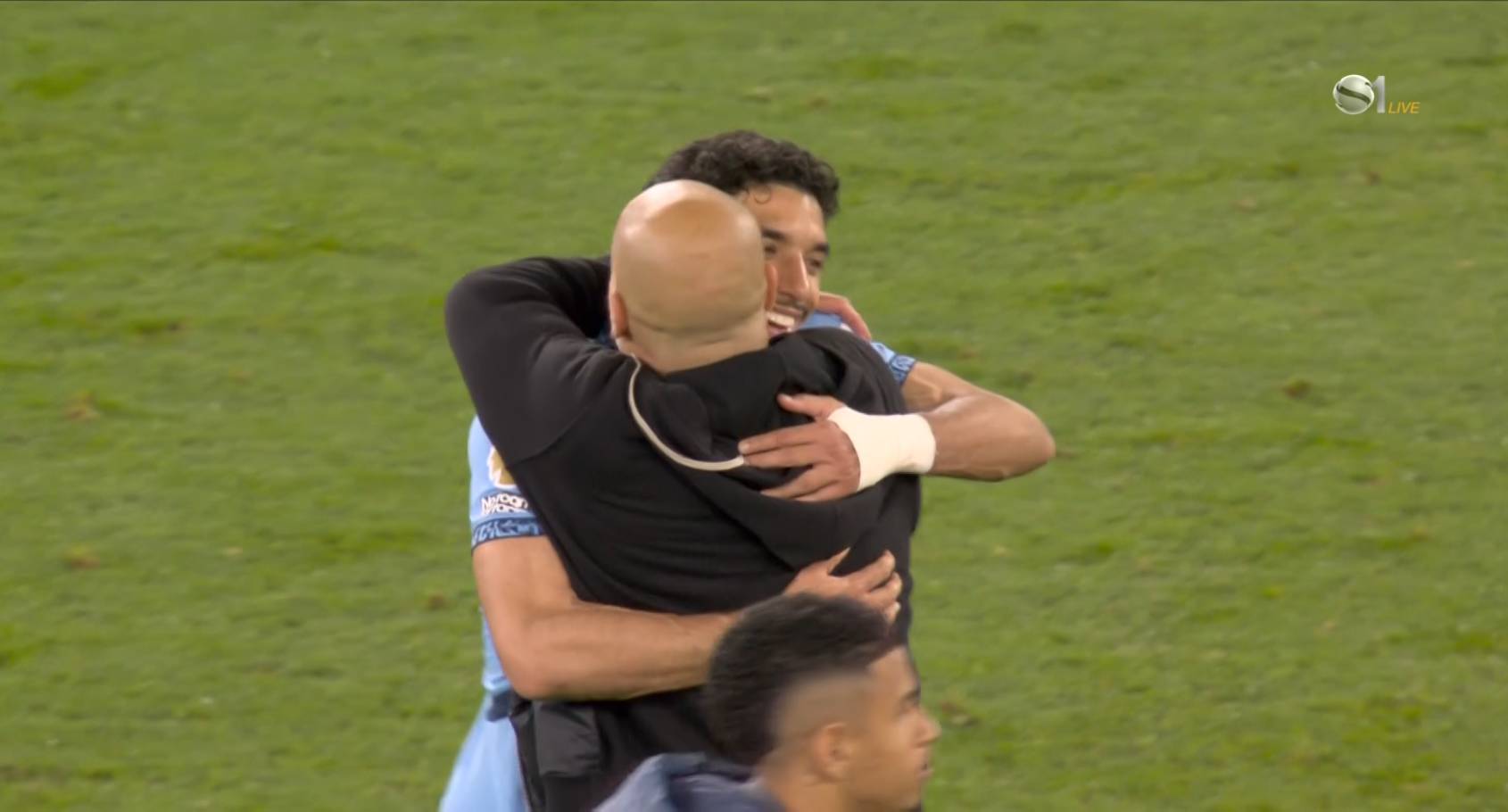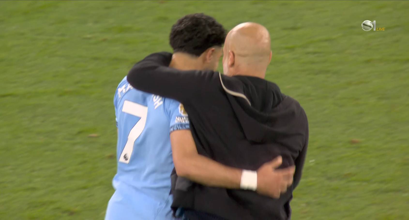 عناق كبير وحار بين فخر مصر عمر مرموش وأسطورة التدريب بيب جوارديولا بعد الفوز في اللحظات الأخيرة على حساب أستون فيلا