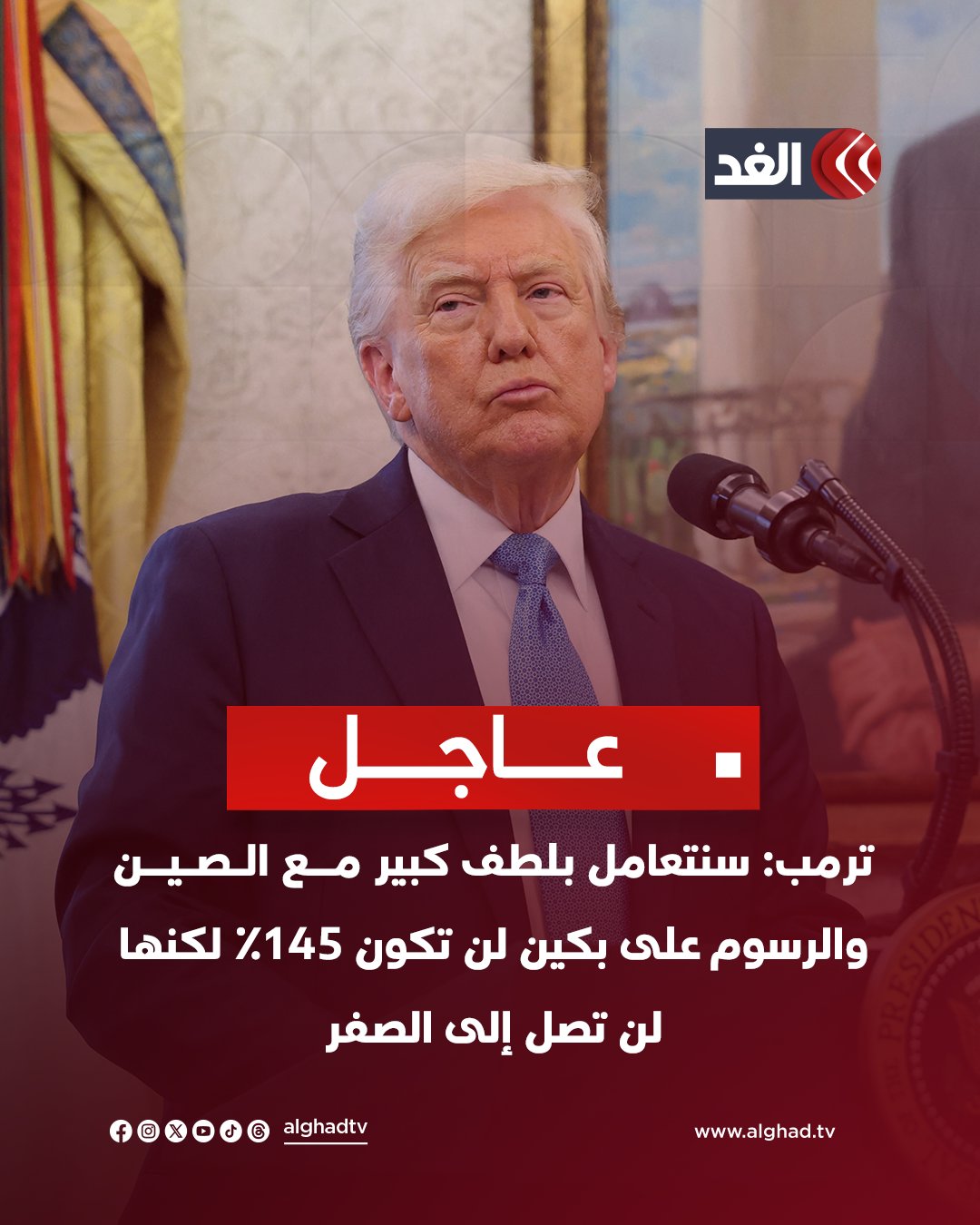 عاجل | ترمب: - سنتعامل بلطف كبير مع الصين والرسوم على بكين لن تكون 145% لكنها لن تصل إلى الصفر - أحرزنا تقدما كبيرا في الشرق الأوسط وسنرى ما يحدث في غزة - هذا هو العصر الذهبي للولايات المتحدة وأعتقد أن الصين تريد أن تكون جزءًا من هذا العصر