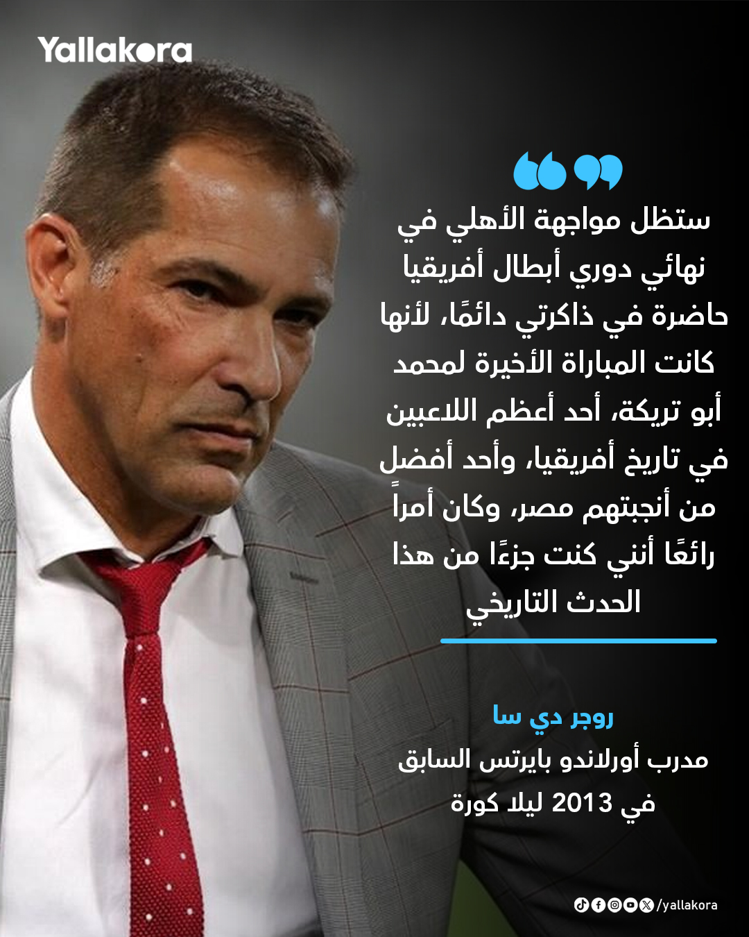 روجر دي سا مدرب أورلاندو بايرتس السابق في 2013 ليلا كورة: "ستظل مواجهة الأهلي في نهائي دوري أبطال أفريقيا حاضرة في ذاكرتي دائمًا، لأنها كانت المباراة الأخيرة لمحمد أبو تريكة، أحد أعظم اللاعبين في تاريخ أفريقيا"