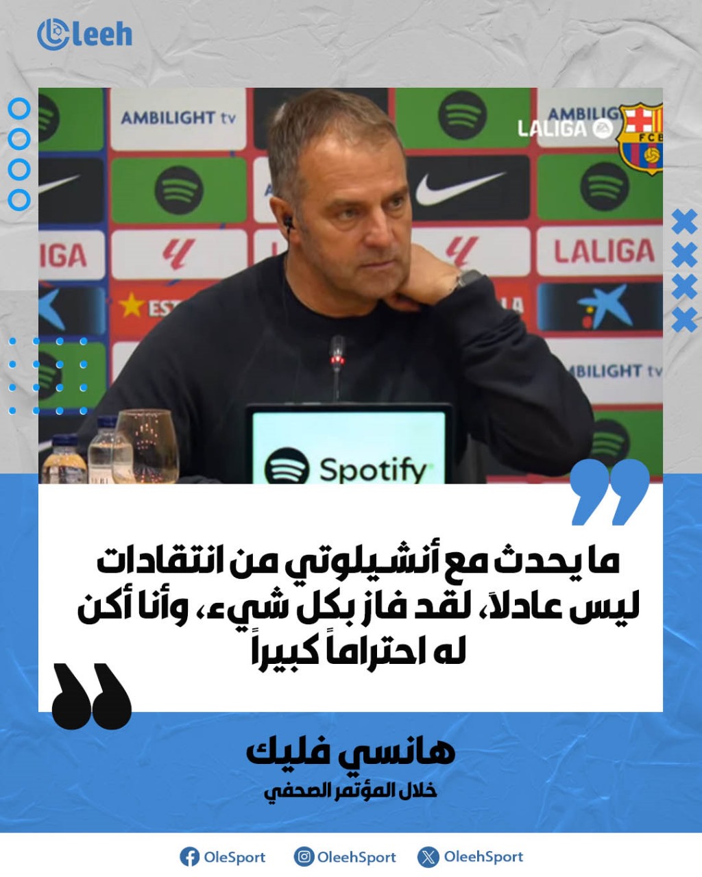 هانسي فليك. "ما يحدث مع أنشيلوتي من انتقادات ليس عادلاً، لقد فاز بكل شيء، وأنا أكن له احتراماً كبيراً"
