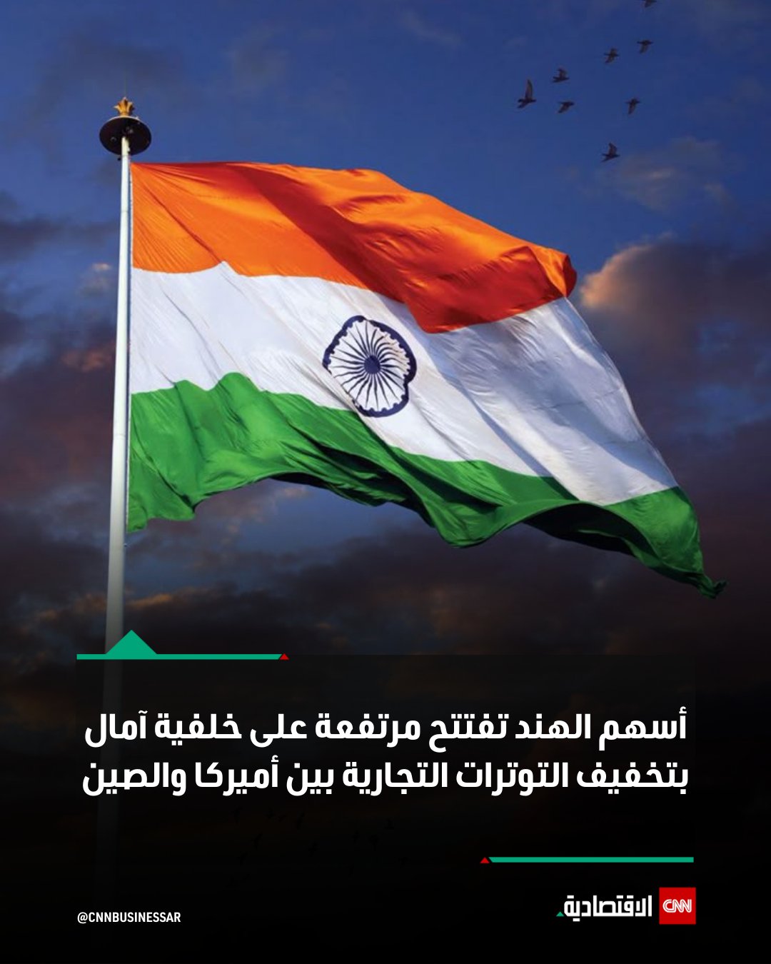 افتتحت مؤشرات الأسهم الرئيسية في الهند على ارتفاع يوم الأربعاء، وسط آمال بتخفيف التوترات التجارية، بعدما صرّح الرئيس الأميركي دونالد ترامب بأن الرسوم الجمركية على الواردات الصينية ستنخفض بشكل كبير بعد التوصل إلى اتفاق، لكنها لن تُلغى بالكامل.. ارتفع مؤشر «نيفتي 50» بنسبة 0.79 بالمئة ليصل إلى 24,357.6 نقطة، بينما صعد مؤشر «سينسكس» بنسبة 0.69 بالمئة ليصل إلى 80,142.09 نقطة بحلول الساعة 9:15 صباحاً بتوقيت الهند. #العالم_بلغة_الأعمال