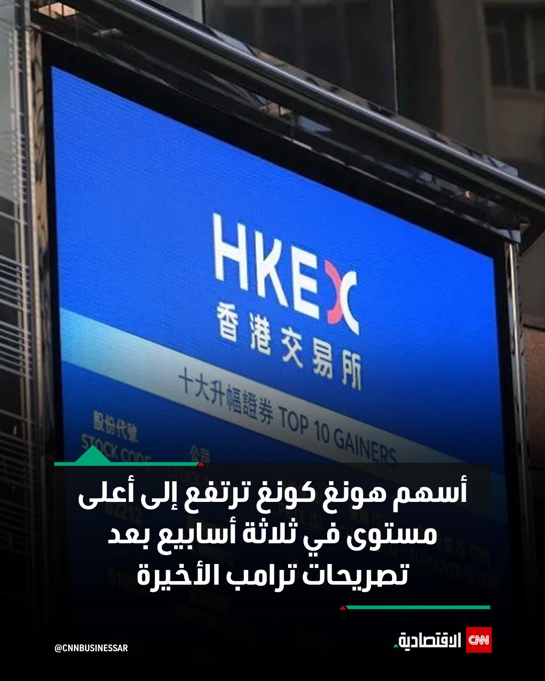 ارتفعت أسهم هونغ كونغ إلى أعلى مستوى لها في ثلاثة أسابيع يوم الأربعاء، متتبعةً مكاسب الأسهم العالمية، وسط التفاؤل بشأن احتمال تخفيف التوترات التجارية بين الصين والولايات المتحدة وضمانات الرئيس الأميركي دونالد ترامب بعدم إقالة رئيس مجلس الاحتياطي الفيدرالي.. بحلول فترة استراحة منتصف النهار، ارتفع مؤشر هانغ سنغ القياسي بنسبة 2.41% ليصل إلى 22,081.42 نقطة، وهو أعلى مستوى له منذ 3 أبريل.. كما ارتفع مؤشر هانغ سنغ لأسهم الشركات الصينية بنسبة 2.15%، في حين قفز مؤشر هانغ سنغ للتكنولوجيا بنسبة 3.11%.. استقرت معنويات السوق بعد تصريحات أكثر توافقاً من الرئيس ترامب وزيادة الآمال بتخفيف التوترات التجارية بين الولايات المتحدة والصين، حسب ما قال محللو "أو سي بي سي" في مذكرة. #العالم_بلغة_الأعمال
