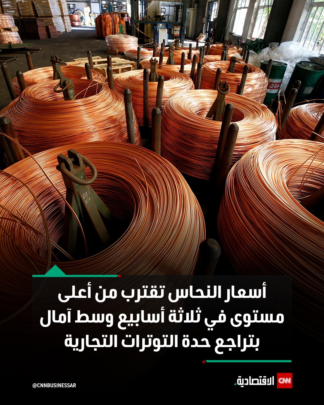 ارتفعت أسعار النحاس في لندن، يوم الأربعاء، لتقترب من أعلى مستوياتها في ثلاثة أسابيع، بعدما أدلى الرئيس الأميركي دونالد ترامب بتصريحات تشير إلى تهدئة في التوترات التجارية مع الصين، غير أن قوة الدولار حدّت من المكاسب.. وصعد سعر النحاس القياسي للتسليم بعد ثلاثة أشهر في بورصة لندن للمعادن بنسبة 0.4% إلى 9,409.5 دولار للطن المتري، بحلول الساعة 03:41 بتوقيت غرينتش، وكان قد لامس لفترة وجيزة 9,481.5 دولار، وهو أعلى مستوى منذ 3 نيسان أبريل.. وفي بورصة شنغهاي للعقود الآجلة، ارتفع العقد الأكثر تداولاً للنحاس بنسبة 1.07% ليصل إلى 77,770 يواناً (ما يعادل 10,651.24 دولار) للطن المتري. #العالم_بلغة_الأعمال