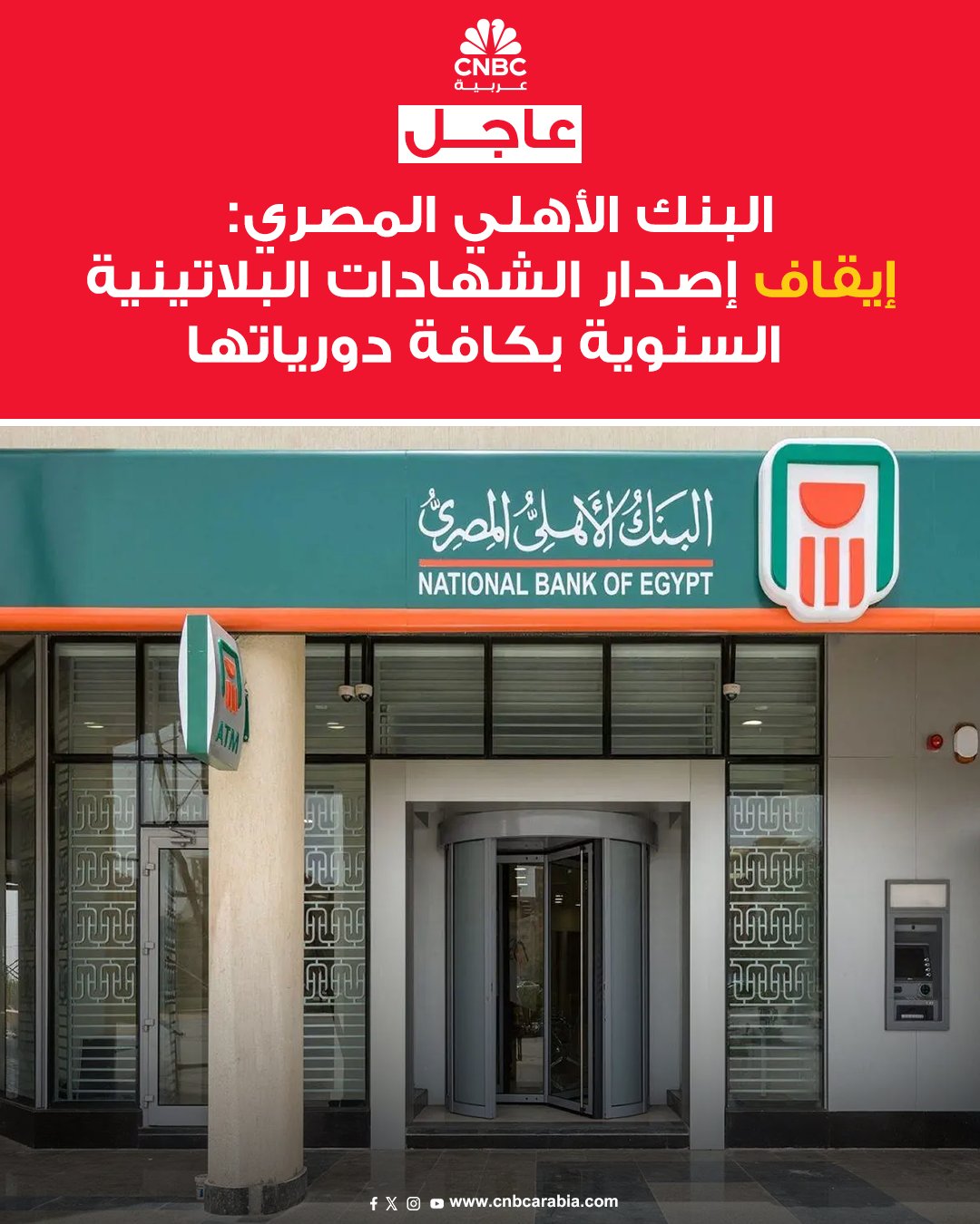 البنك الأهلي المصري: إيقاف إصدار الشهادات البلاتينية السنوية بكافة دورياتها. تخفيض العائد على الشهادات البلاتينية 3 سنوات بنسبة 2%. تغيير العائد على الشهادة البلاتينية ذات العائد المتغير بنسبة 2.25%. القرارات الجديدة تسري اعتباراً من يوم الأحد المقبل #عاجل