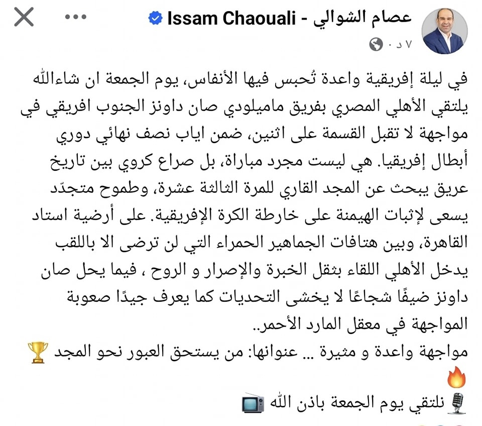 مواجهة تُحبس فيها الأنفاس.. الشوالي يعلن التعليق على مباراة الأهلي وصنداونز بدوري الأبطال