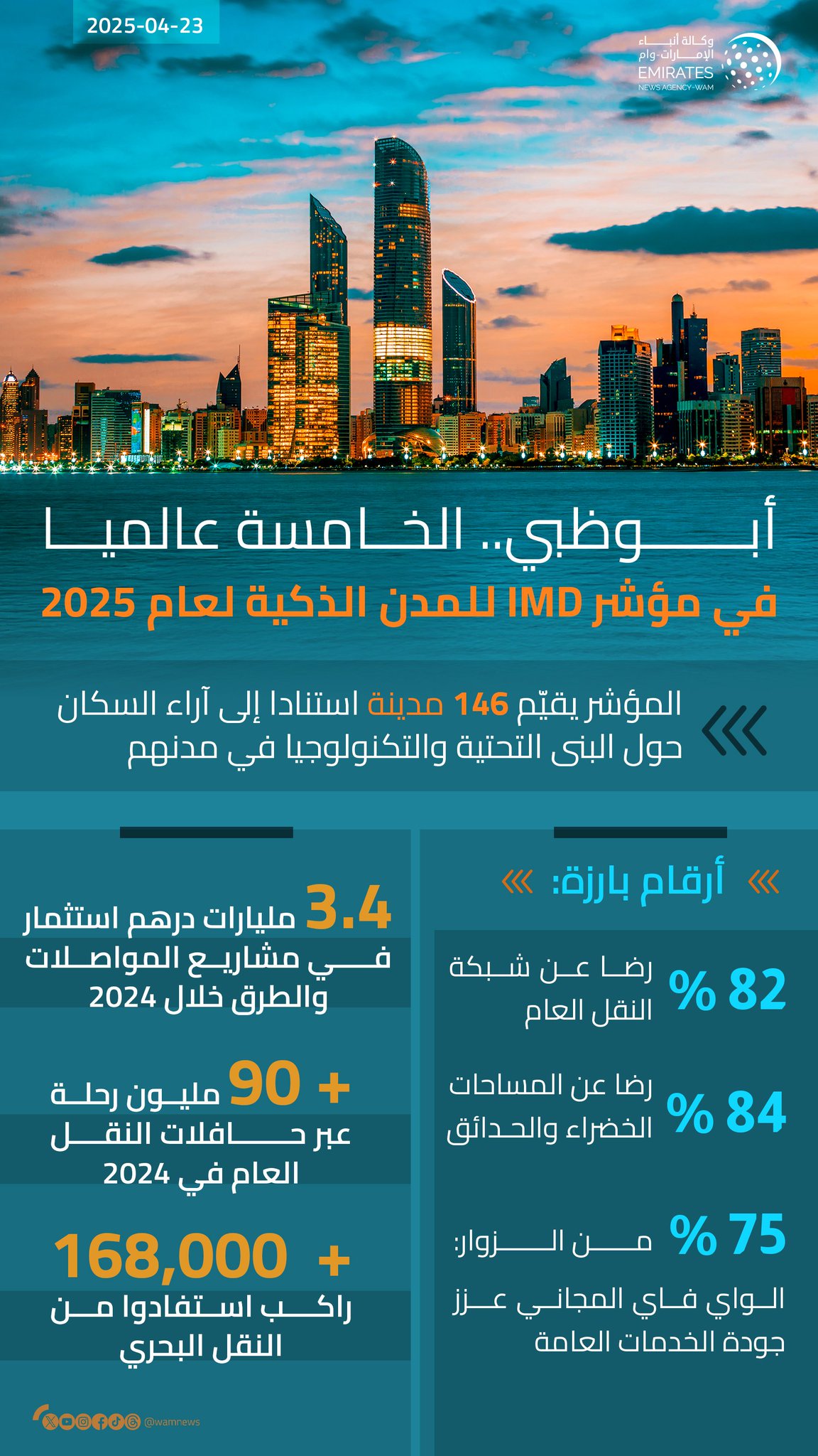 تقدَّمت أبوظبي إلى المركز الخامس في تصنيف مؤشر المدن الذكية لعام 2025، الصادر عن المعهد الدولي للتنمية الإدارية (IMD) من تصنفيها في المركز العاشر في عام 2024، متجاوزةً العديد من العواصم العالمية الكبرى، نتيجة توسيع رقعة مساحاتها الخضراء، وتوفيرها خدمة الواي فاي المجانية ووسائل النقل العام المتطوِّرة، إضافةً إلى إدارتها الفعَّالة لحركة المرور.