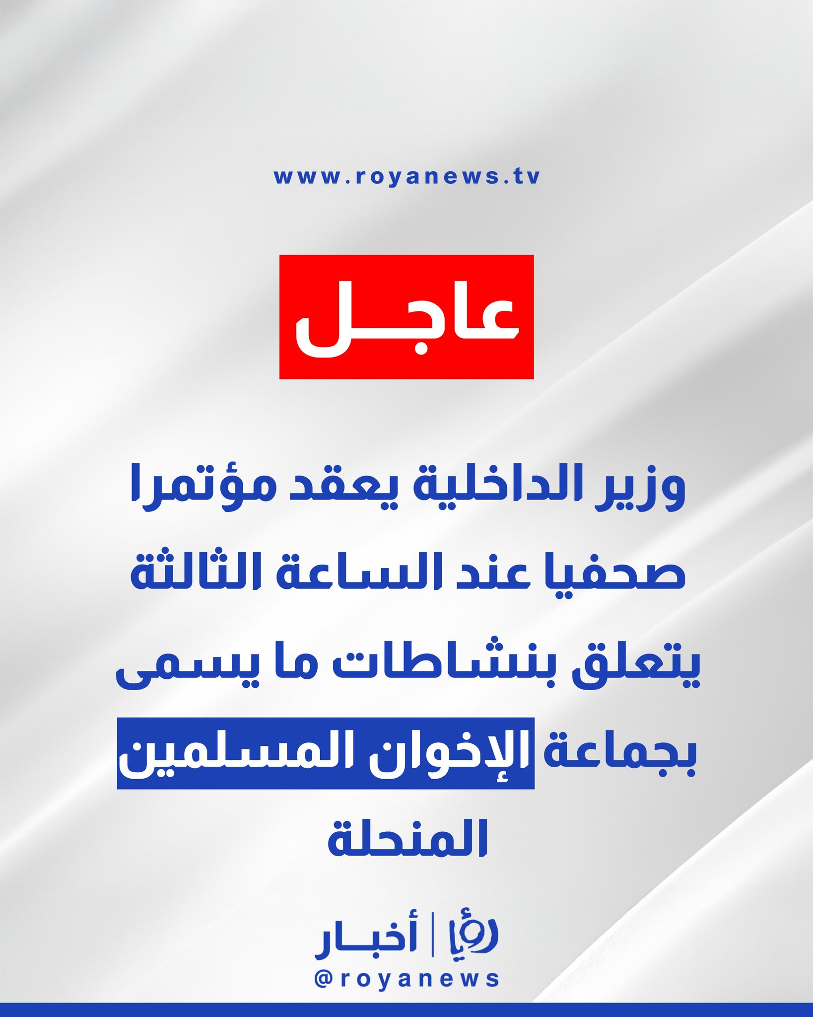 وزير الداخلية يعقد مؤتمرا صحفيا عند الساعة الثالثة مساء الأربعاء يتعلق بنشاطات ما يسمى بجماعة الإخوان المسلمين" المنحلة #عاجل