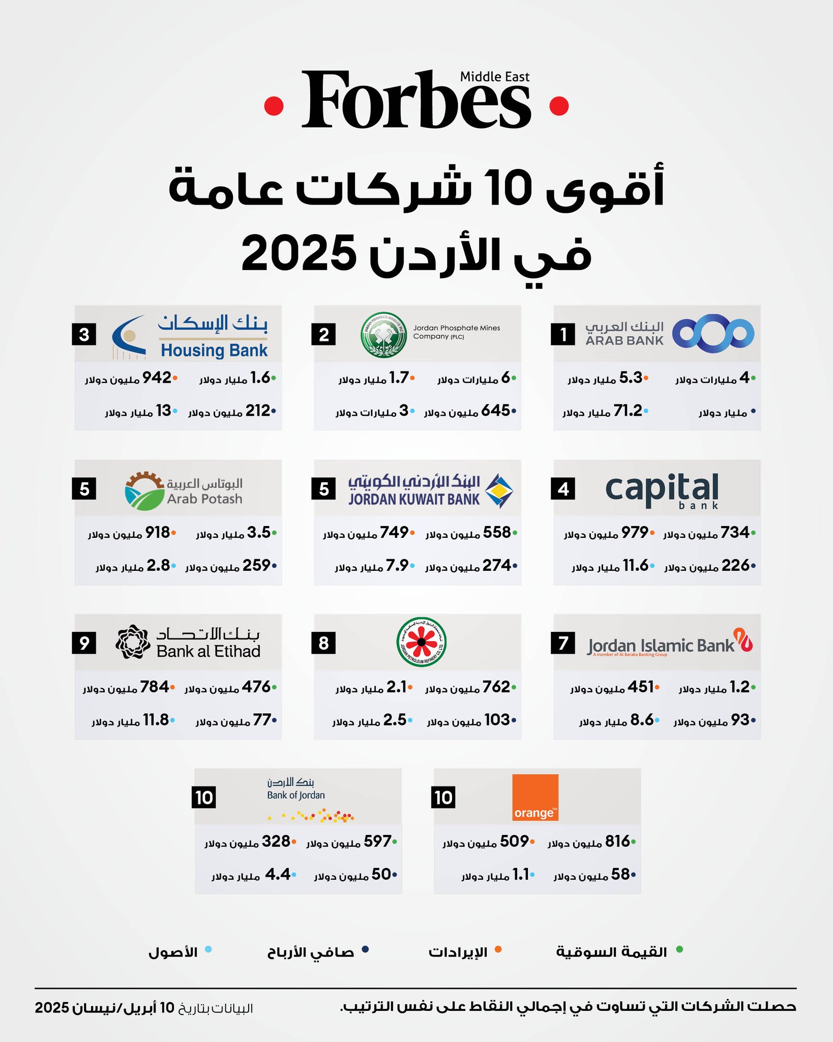 المنهجية تم جمع البيانات من القوائم المالية المجمعة للشركات المدرجة في بورصة عمّان، واستندت إلى الإيرادات، والأصول، والأرباح المُعلنة للعام المالي 2024، إضافة إلى القيمة السوقية في 10 أبريل/ نيسان 2025. وقد تم إعطاء وزن متساوٍ لكل معيار من هذه المعايير. وقد حصلت الشركات التي تساوت في إجمالي النقاط على الترتيب نفسه.