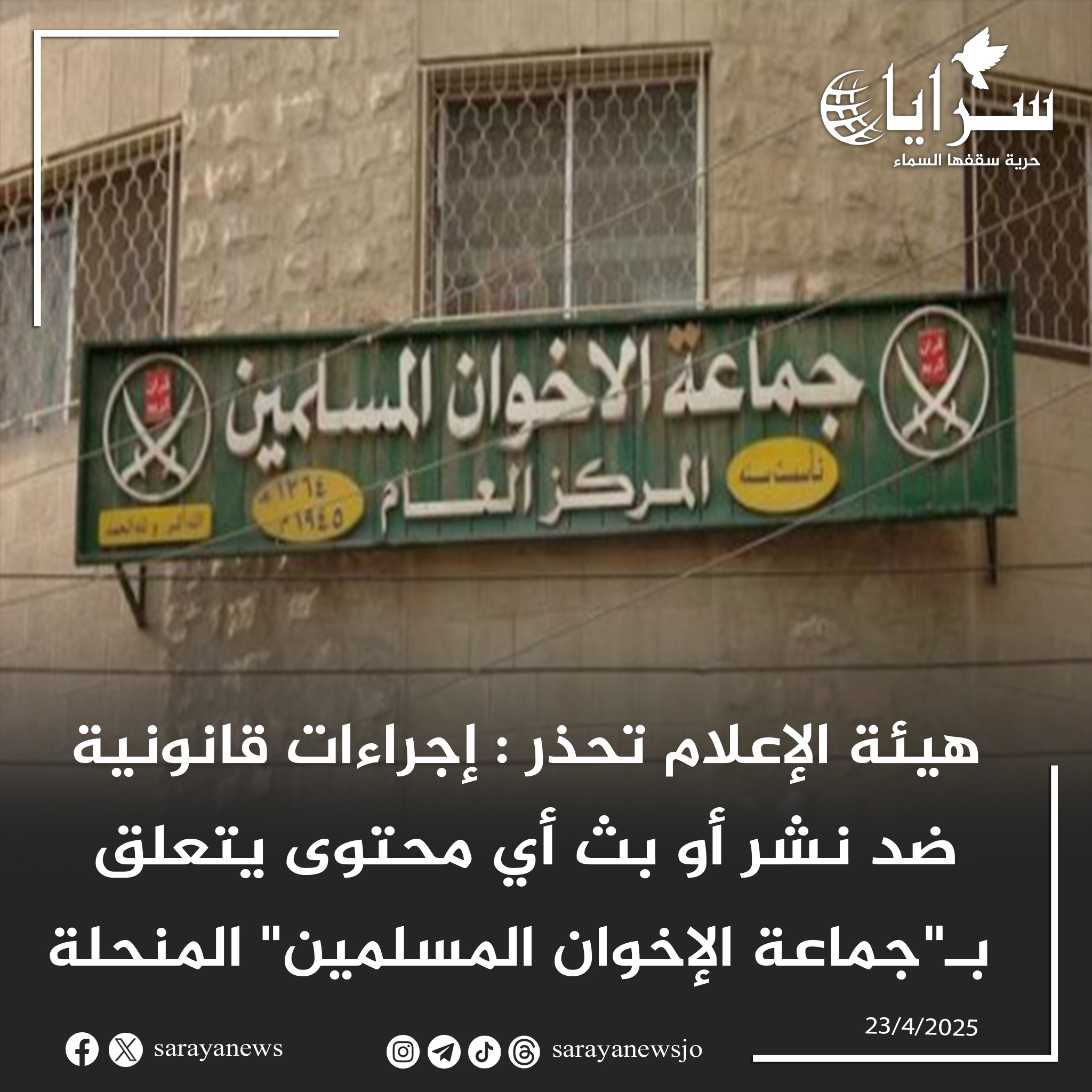 سرايا - أعلنت هيئة الإعلام في تعميم أصدرته الأربعاء أنه سيتم اتخاذ الإجراءات القانونية بمنع نشر أو بث أو إعادة نشر أو إعادة بث أو التعامل بأي شكل من الأشكال مع ما يسمى بـــــ "جماعة الإخوان المسلمين" المنحلة.