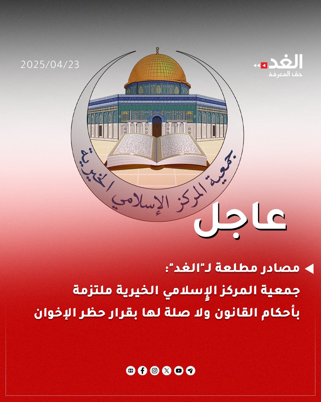 هديل غبون أكدت مصادر مطلعة، بأن جمعية المركز الإٍسلامي الخيرية، ملتزمة بأحكام القانون، ولا صلة لها بقرار الحكومة المتعلق "بحظر جماعة الإخوان المسلمين وأنشطتها"، حيث تم انتخاب هيئة إدارية جديدة لها في شهر نوفمبر ( تشرين الثاني) 2024، للمرة الأولى من العام 2006.