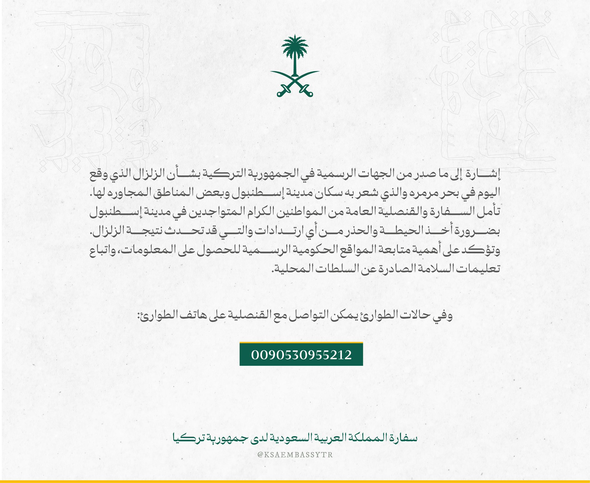 سفارة المملكة في تركيا: إشارة إلى ما صدر من الجهات الرسمية في تركيا بشأن الزلزال الذي وقع اليوم في بحر مرمره والذي شعر به سكان إسطنبول وبعض المناطق المجاورة لها.. نأمل من المواطنين في إسطنبول بأخذ الحيطة والحذر من أي ارتدادات والتي قد تحدث نتيجة الزلزال وفي حالات الطوارئ يمكن التواصل مع القنصلية على هاتف الطوارئ. 0090530955212