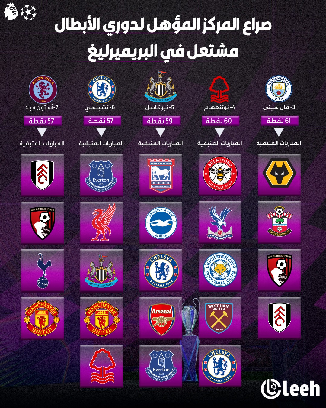 المباريات المتبقية أمام 5 فرق إنجليزية تنافس على المراكز المؤهلة لدوري أبطال أوروبا الموسم القادم.. 4 نقاط فاصلة بينهم في صراع على 3 مراكز تؤهل للشامبيونزليج مع تبقى 5 جولات على نهاية الموسم (لعب السيتي وأستون فيلا مباراتهم الليلة الماضية)