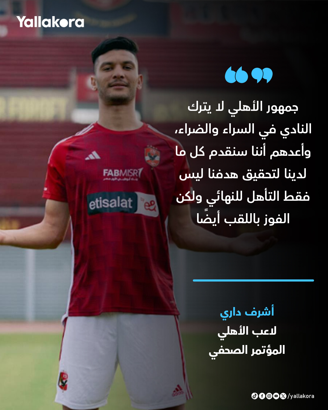 أشرف داري. "جمهور الأهلي لا يترك النادي في السراء والضراء، وأعدهم أننا سنقدم كل ما لدينا لتحقيق هدفنا ليس فقط التأهل للنهائي ولكن الفوز باللقب أيضًا"