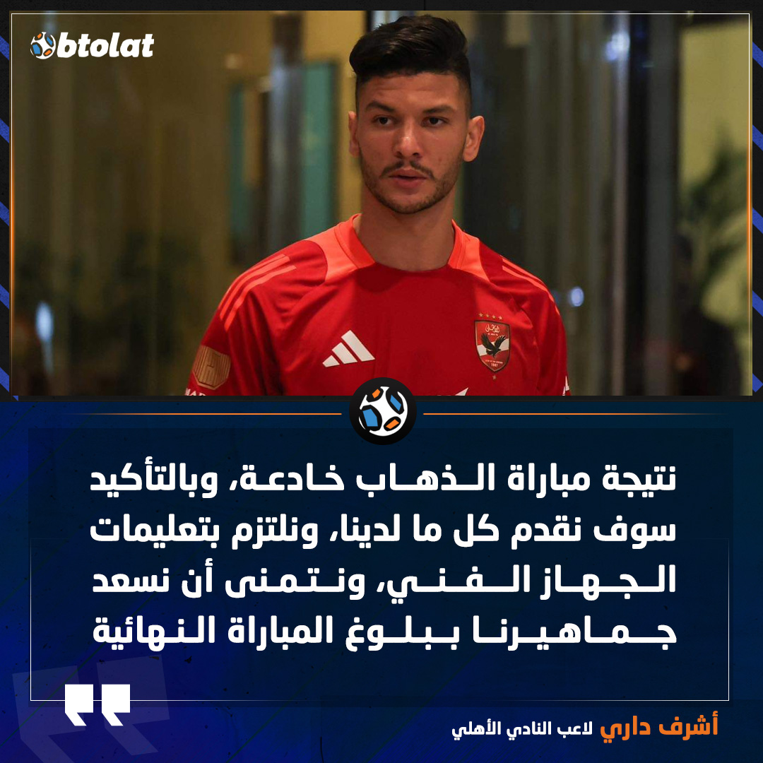 أشرف داري. نتيجة مباراة الذهاب خادعة، وبالتأكيد سوف نقدم كل ما لدينا، ونلتزم بتعليمات الجهاز الفني، ونتمنى أن نسعد جماهيرنا ببلوغ المباراة النهائية