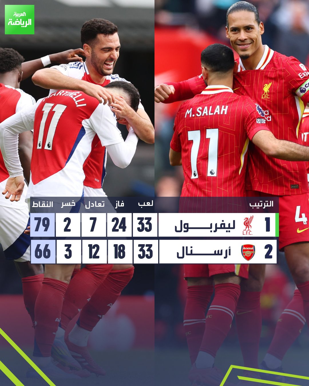سيتوج ليفربول بطلاً للدوري الإنجليزي مساء الأربعاء، إذا خسر أرسنال أمام كريستال بالاس. في حال تعادل أرسنال مع كريستال بالاس سيكون ليفربول على بعد نقطة واحدة فقط من التتويج باللقب. ليفربول سيواجه توتنهام يوم الأحد المقبل _رياضة