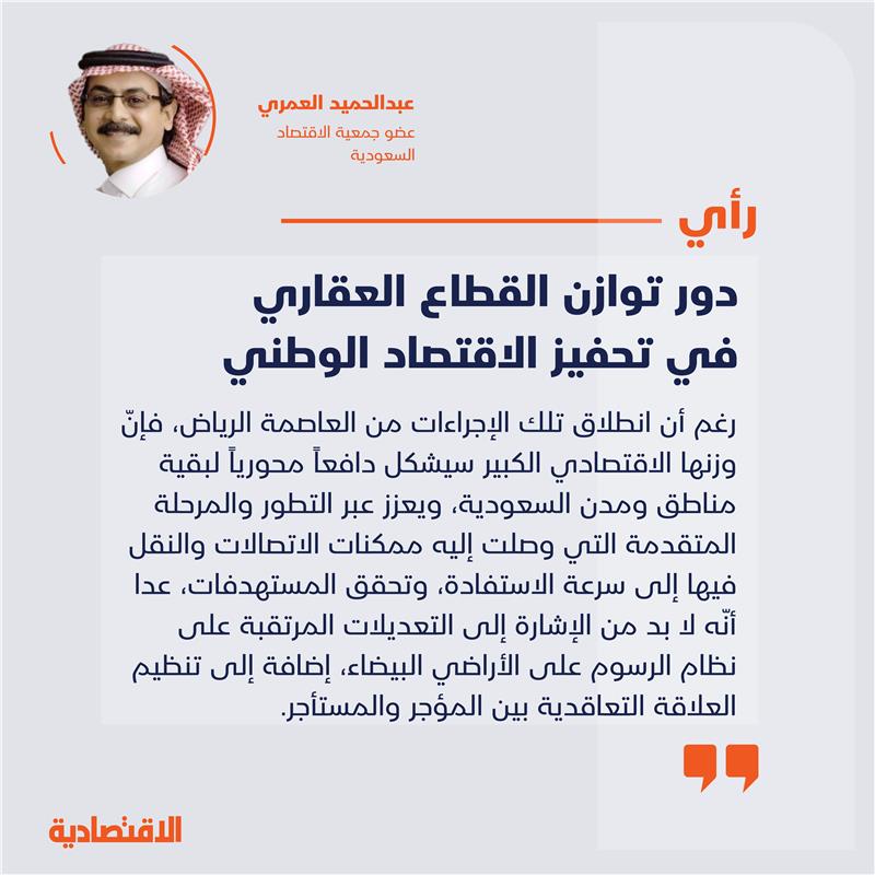 رغم أن انطلاق تلك الإجراءات من العاصمة الرياض، فإنّ وزنها الاقتصادي الكبير سيشكل دافعاً محورياً لبقية مناطق ومدن السعودية، ويعزز عبر التطور والمرحلة المتقدمة التي وصلت إليه ممكنات الاتصالات والنقل في السعودية إلى سرعة الاستفادة، وتحقق المستهدفات المقررة من كل تلك الإجراءات، عدا أنّه لا بد من الإشارة إلى التعديلات المرتقبة على نظام الرسوم على الأراضي البيضاء، إضافة إلى تنظيم العلاقة التعاقدية بين المؤجر والمستأجر،.....