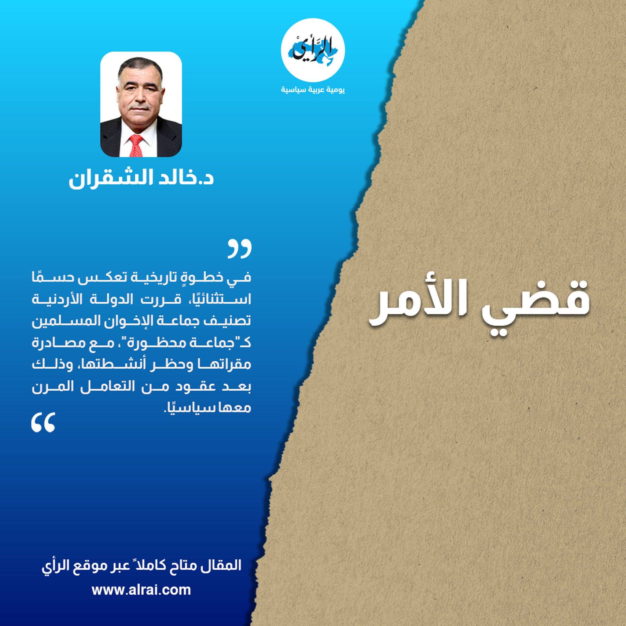 د. خالد الشقران في خطوةٍ تاريخية تعكس حسمًا استثنائيًا، قررت الدولة الأردنية تصنيف جماعة الإخوان المسلمين كـ"جماعة محظورة"، مع مصادرة مقراتها وحظر أنشطتها، وذلك بعد عقود من التعامل المرن معها سياسيًا.