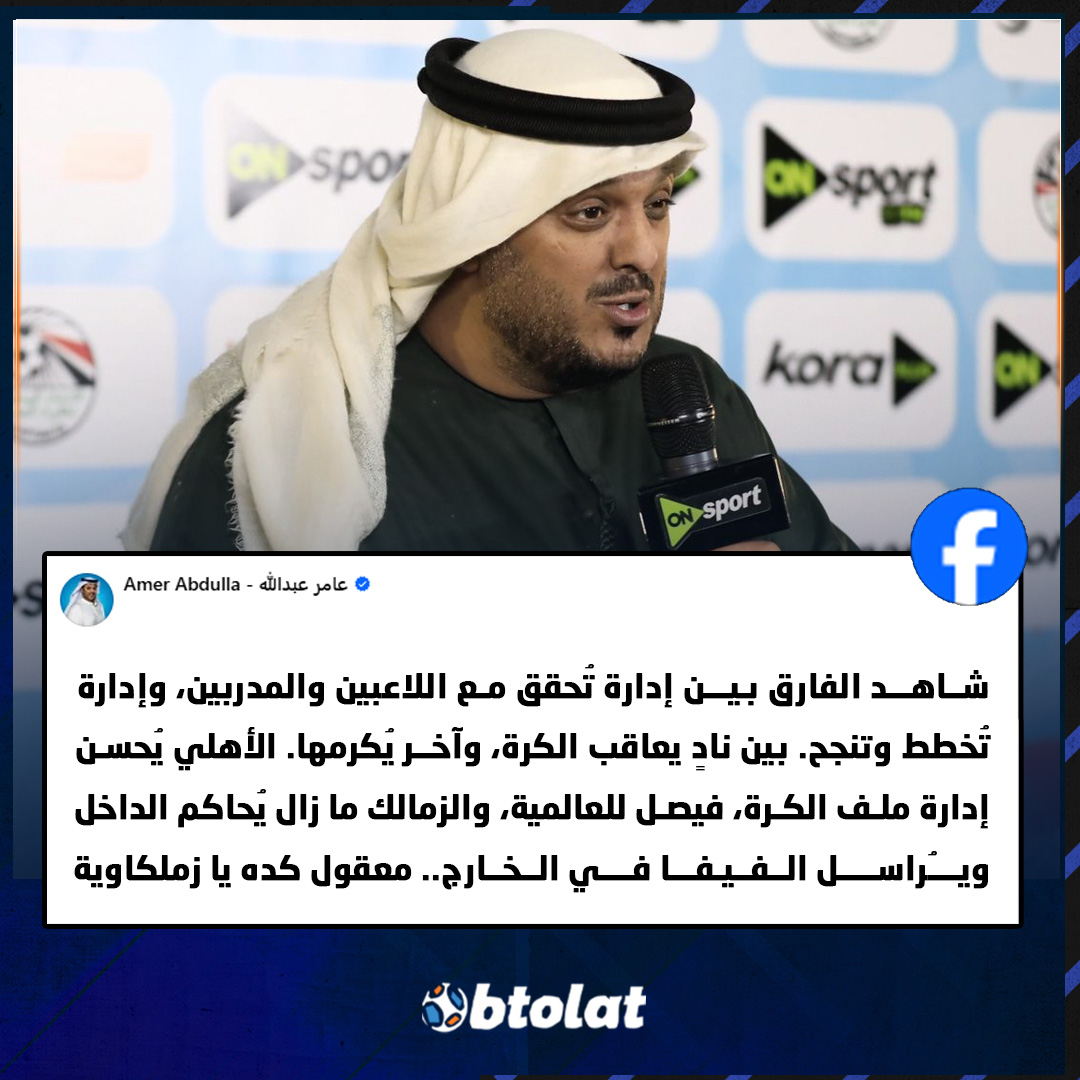 "شاهد الفارق بين إدارة تُحقق مع اللاعبين والمدربين، وإدارة تُخطط وتنجح. بين نادٍ يعاقب الكرة، وآخر يُكرمها. الأهلي يُحسن إدارة ملف الكرة، فيصل للعالمية، والزمالك ما زال يُحاكم الداخل ويُراسل الفيفا في الخارج.. معقول كده يا زملكاوية". المعلق الإماراتي عامر عبدالله عبر فيسبوك