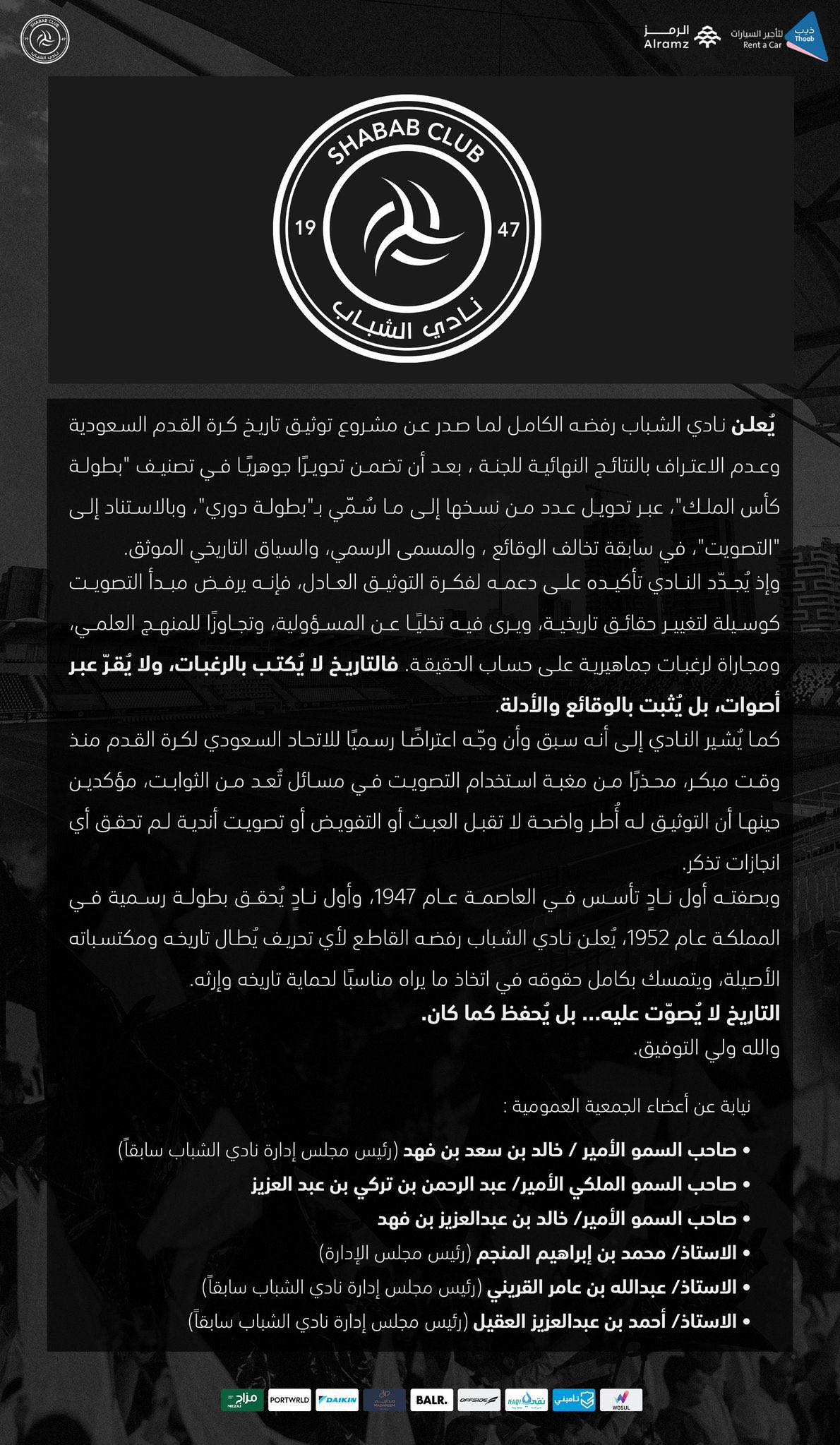 نادي الشباب يعلن في بيان صحافي رفضه ما صدر عن مشروع توثيق تاريخ كرة القدم السعودية وعدم الاعتراف بالنتائج النهائية للجنة.