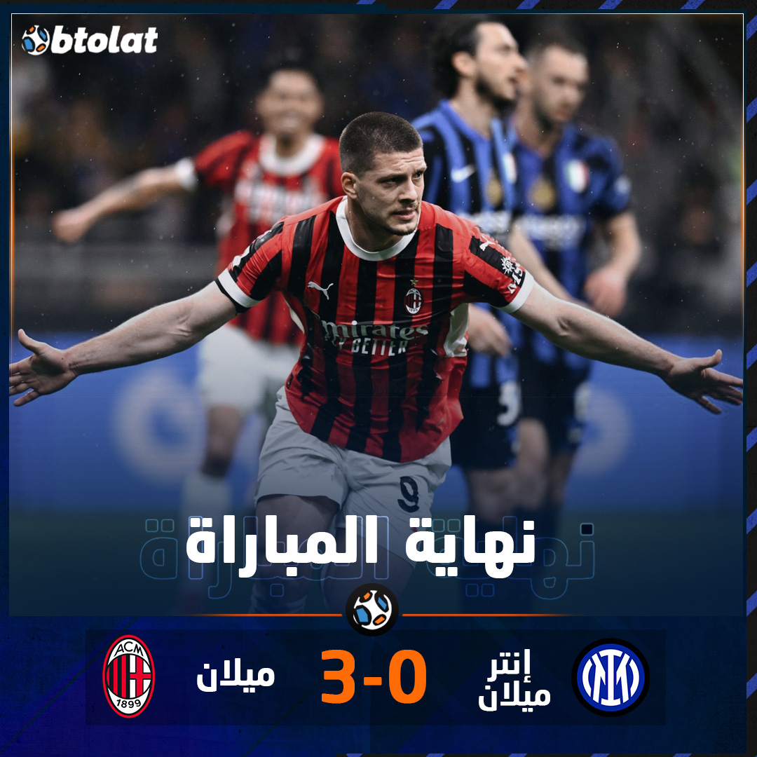 نهاية المباراة! ميلان يتأهل إلى نهائي كأس إيطاليا بعد الإطاحة بجاره إنتر ميلان خارج البطولة بالفوز عليه بنتيجة 4-1 بمجموع لقائي الذهاب والعودة في انتظار الفائز من بولونيا وإمبولي