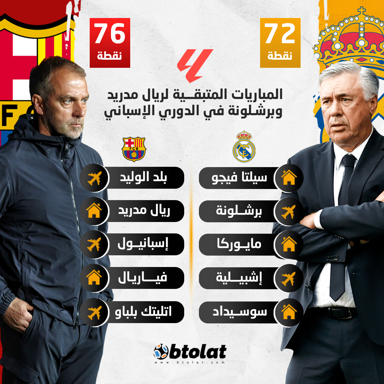 المنافسة مشتعلة. إليكم المباريات المتبقية للثنائي ريال مدريد وبرشلونة في الليجا هذا الموسم. برأيك من سيتوج باللقب؟