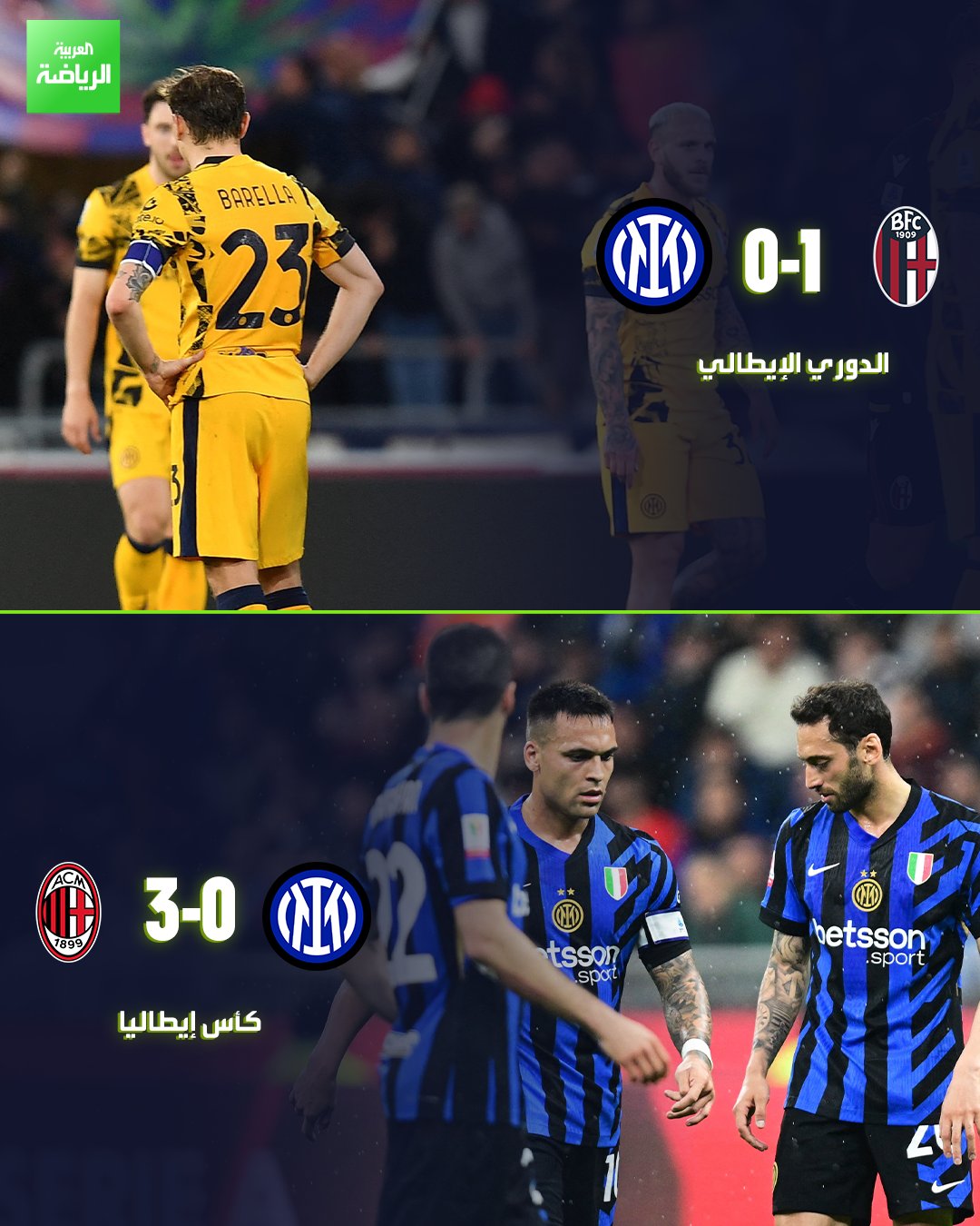 إنتر ميلان خلال أقل من أسبوع. الأحد: خسر أمام بولونيا وفشل في تعزيز صدارته للدوري الإيطالي. الأربعاء: خسر أمام ميلان بثلاثية وخرج من نصف نهائي كأس إيطاليا _رياضة