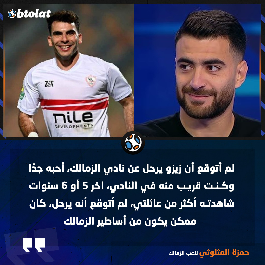 حمزة المثلوثي: لم أتوقع أن زيزو يرحل عن نادي الزمالك، أحبه جدًا وكنت قريب منه في النادي، اخر 5 أو 6 سنوات شاهدته أكثر من عائلتي، لم أتوقع أنه يرحل، كان ممكن يكون من أساطير الزمالك