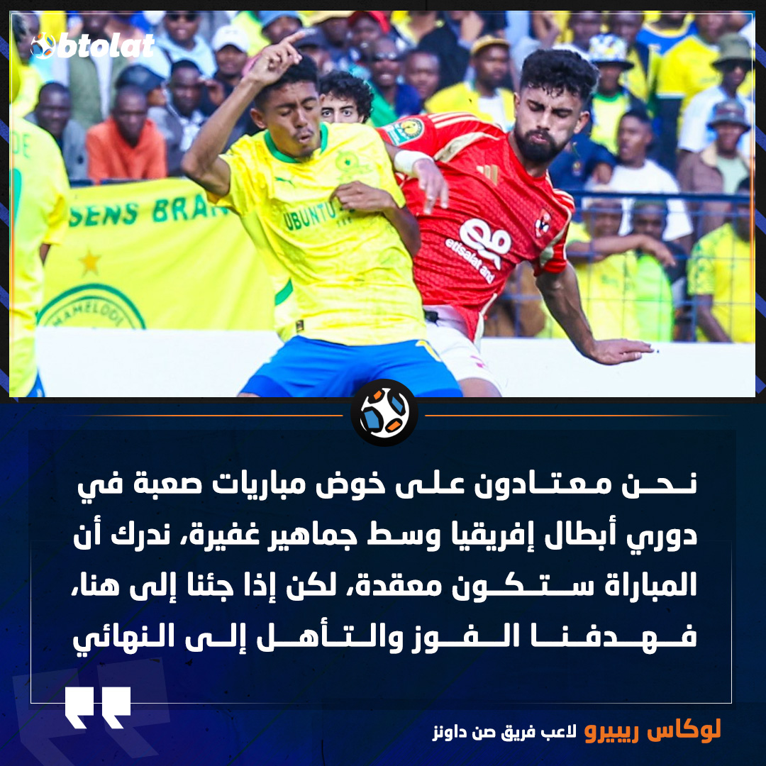 لوكاس ريبيرو لاعب صن داونز. نحن معتادون على خوض مباريات صعبة في دوري أبطال إفريقيا وسط جماهير غفيرة، ندرك أن المباراة ستكون معقدة، لكن إذا جئنا إلى هنا، فهدفنا الفوز والتأهل إلى النهائي