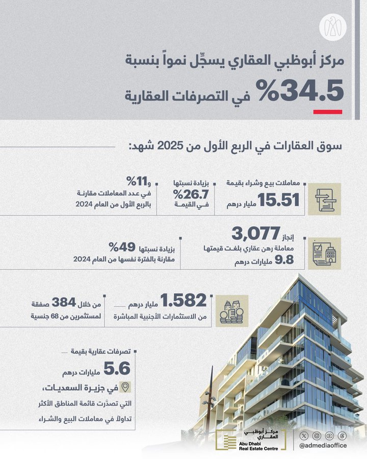 كشف مركز أبوظبي العقاري، التابع لدائرة البلديات والنقل، عن نمو حجم التصرفات العقارية في إمارة أبوظبي خلال الربع الأول من عام 2025 بنسبة 34.5% مقارنةً بالفترة ذاتها من عام 2024، حيث بلغت القيمة الإجمالية للتصرفات العقارية 25.3 مليار درهم، موزَّعة على 6896 معاملة، مقارنة بقيمة 18.82 مليار درهم موزَّعة على 5773 معاملة في عام 2024.