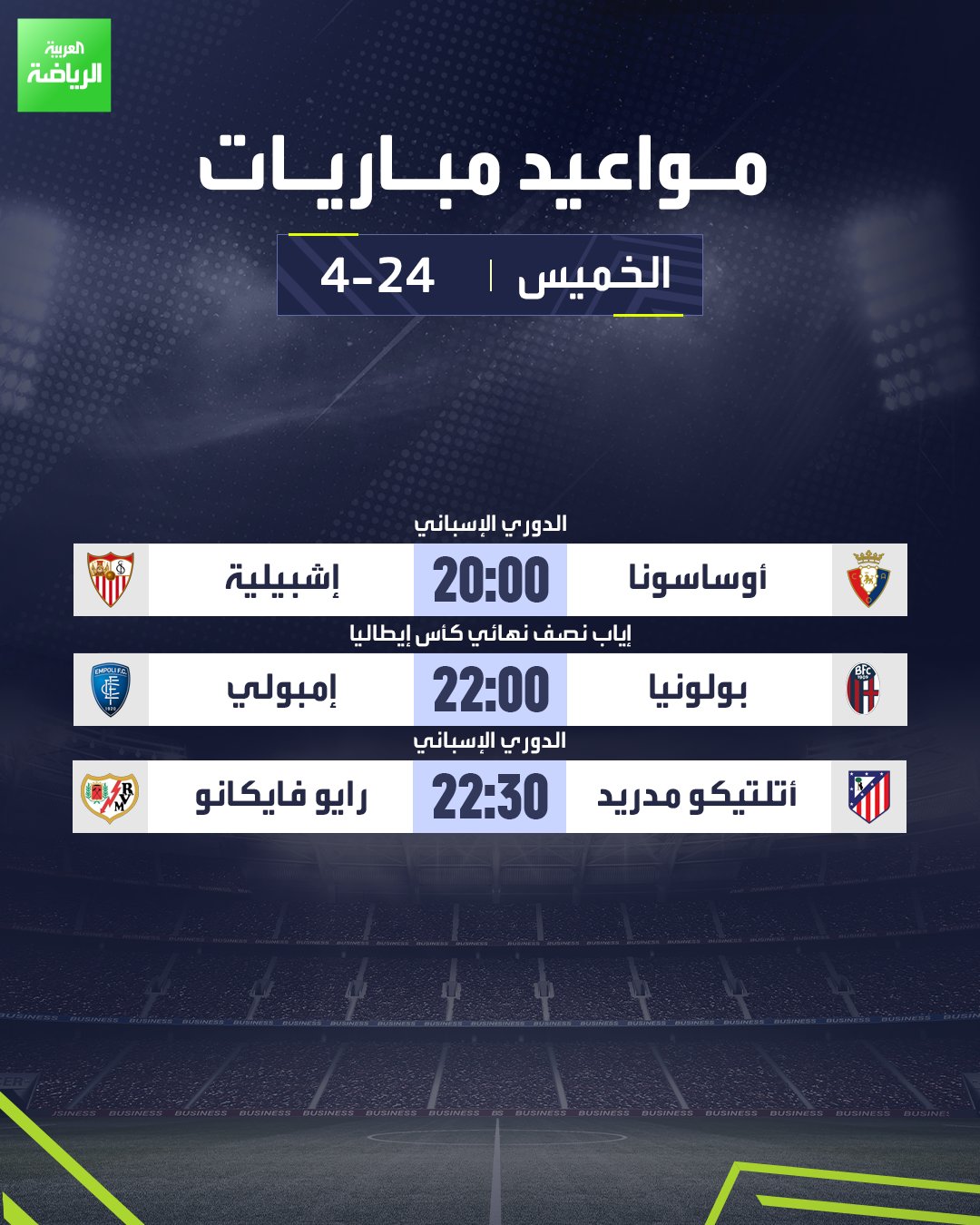 مباريات اليوم. أوساسونا يواجه إشبيلية، وأتلتيكو مدريد يلاقي رايو فايكانو بالدوري الإسباني. بولونيا في مواجهة إمبولي في إياب نصف نهائي كأس إيطاليا _رياضة