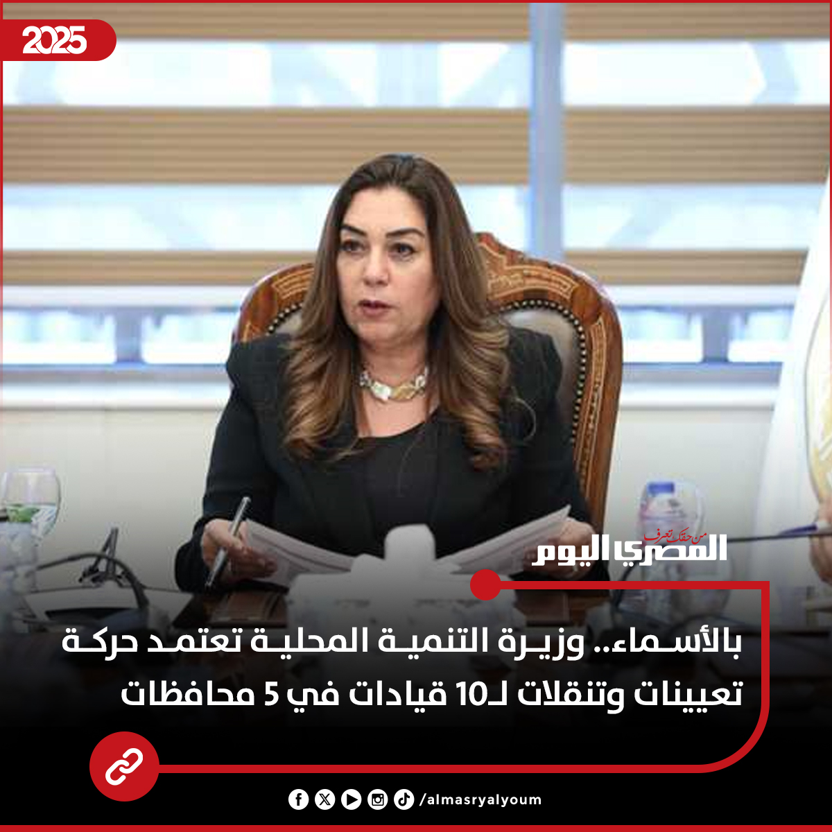 بالأسماء.. وزيرة التنمية المحلية تعتمد حركة تعيينات وتنقلات ل10 قيادات في 5 محافظات #عاجل