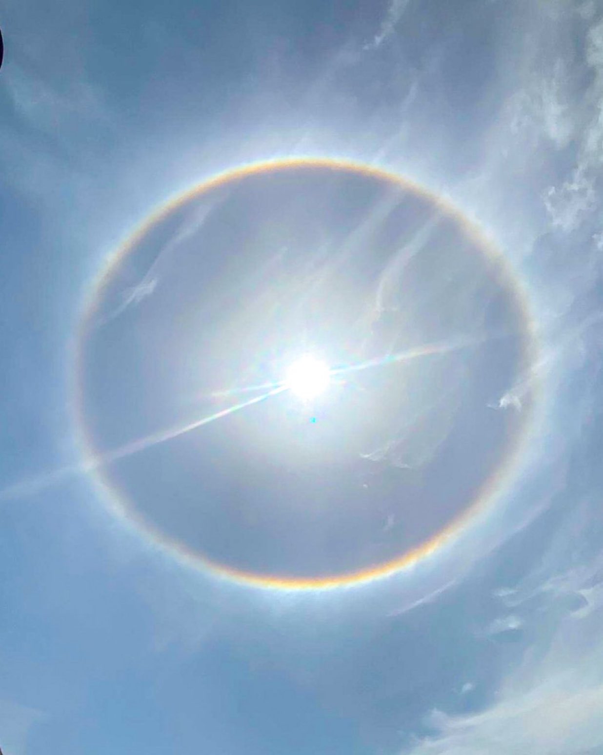 فلكية جدة: رصد صباح اليوم ظهور حلقة ضوئية تحيط بقرص الشمس في قبة السماء بمحافظة صبيا جنوب السعودية تنتج عن انكسار وانعكاس ضوء الشمس عبر بلورات الجليد الموجودة في السحب الرقيقة العالية على ارتفاع 5 إلى 10 كم من سطح الأرض. #الهاله_الشمسيه