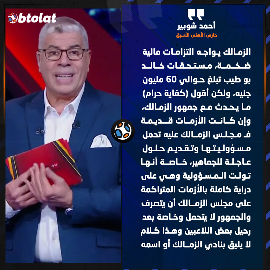 أحمد شوبير: الزمالك يواجه التزامات مالية ضخمة، "ولكن أقول (كفاية حرام) ما يحدث مع جمهور الزمالك، ومجلس الزمالك عليه تحمل مسؤوليتها وتقديم حلول عاجلة للجماهير، وهذا كلام لا يليق بنادي الزمالك أو اسمه