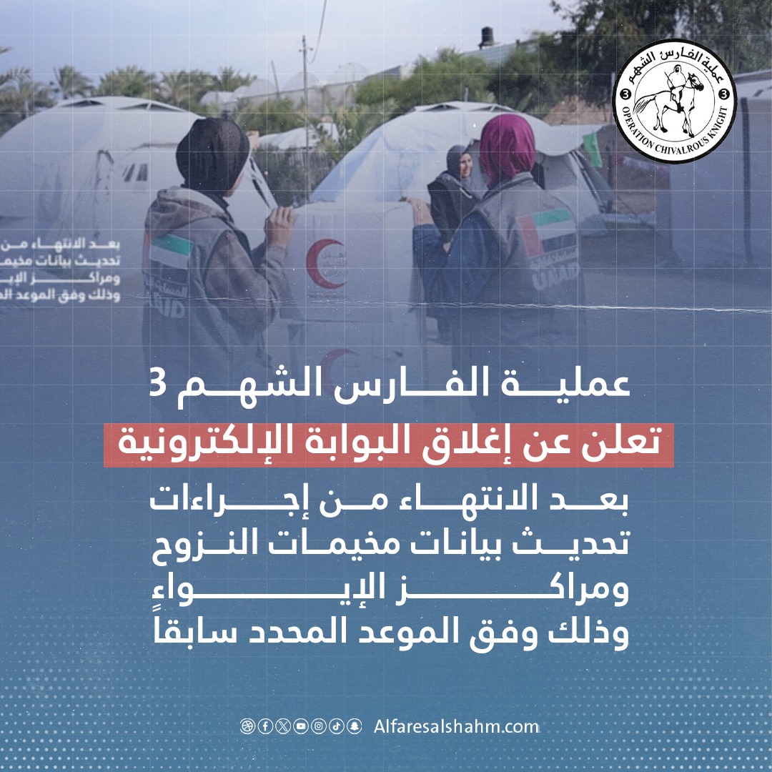 عملية الفارس الشهم 3 تعلن إغلاق البوابة الإلكترونية بعد الإنتهاء من تحديث بيانات مخيمات النزوح ومراكز الإيواء، وذلك وفق الموعد المحدد سابقًا #صحيفة_الخليج
