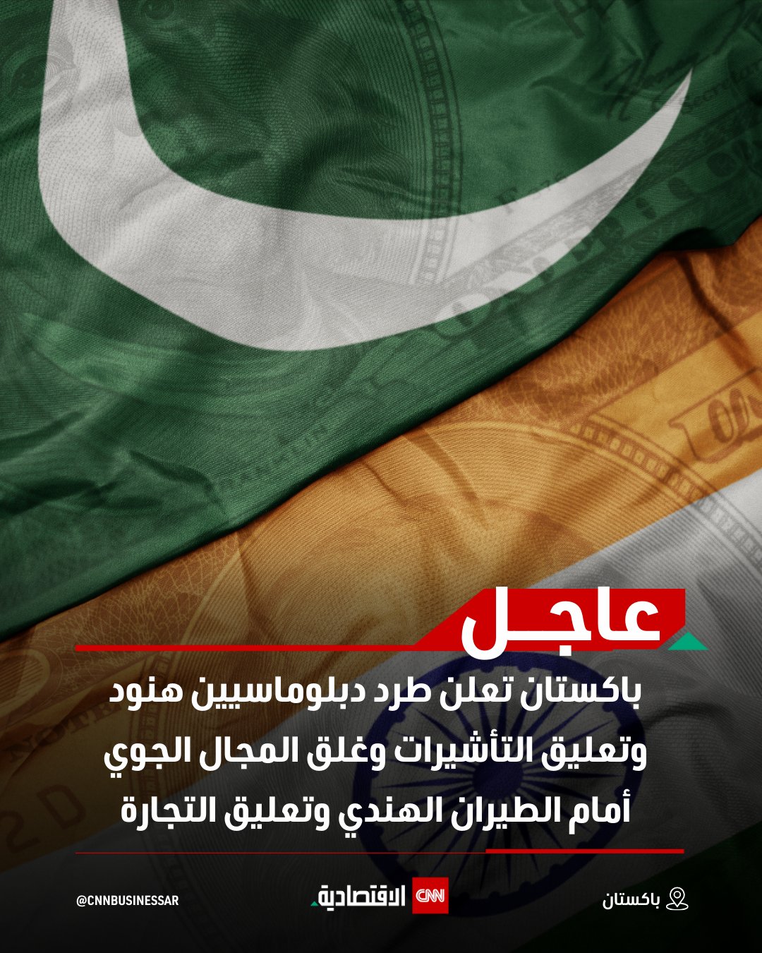 عاجل | باكستان تعلن طرد دبلوماسيين هنود وتعليق التأشيرات وغلق المجال الجوي أمام الطيران الهندي وتعليق التجارة #العالم_بلغة_الأعمال
