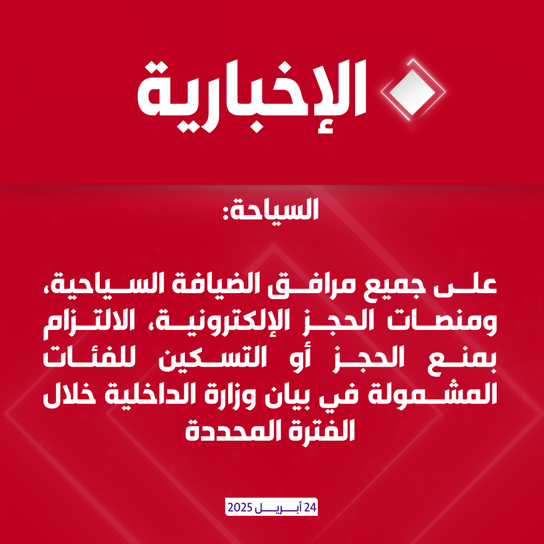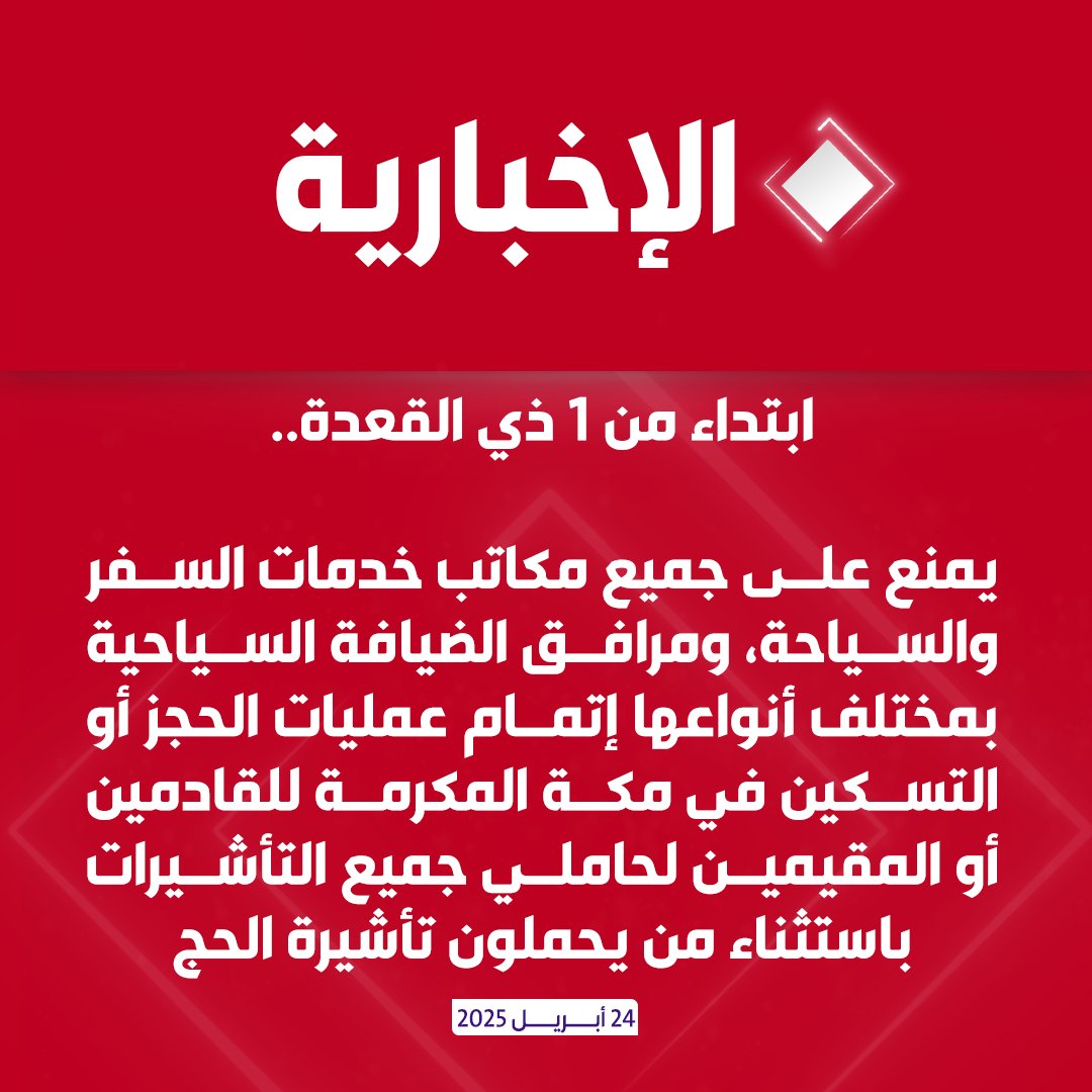 "العقوبات ستنتظر المخالفين"... السياحة في بيان رسمي تشدّد على منع الحجز والتسكين في مكة المكرمة لحاملي جميع التأشيرات باستثناء تأشيرة الحج اعتبارا من 1 ذي القعدة لا حج بلا تصريح | #الإخبارية